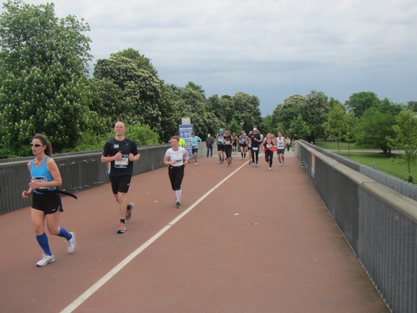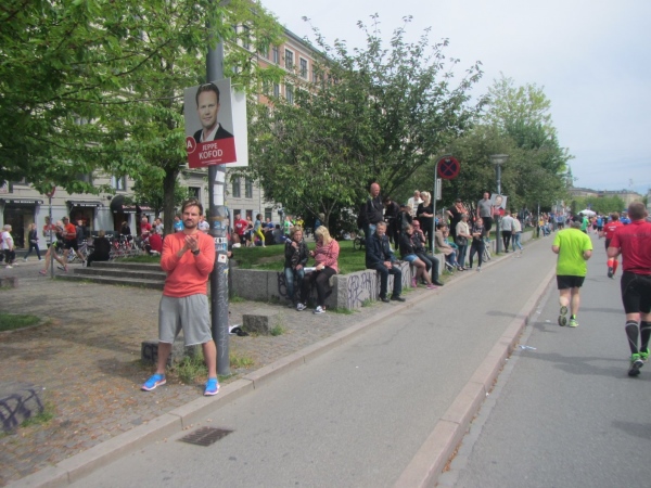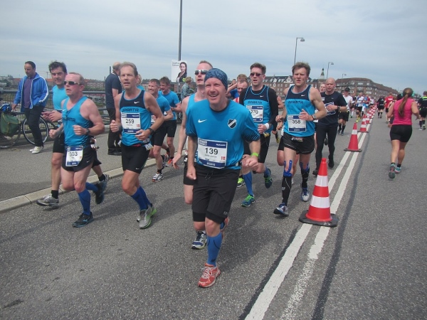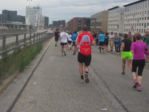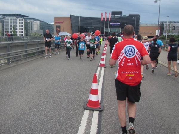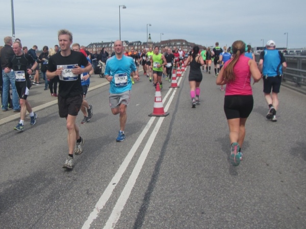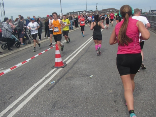 Bei Kilometer 18 kommen uns auf einen leichten Anstieg nahe dem Fiske Torvet die schnelleren Läufer auf der rechten Seite der Straße an ihrem Kilometerpunkt 22 entgegen. Diese haben einen Vorsprung von gut 20 Minuten und mehr herausgeholt. Auf der Brücke, der Dybbølsbro, kommt es dann fast zur Tuchfühlung: nur Pylonen bilden die Grenze zwischen den beiden Läufergruppen, die aufeinander zukommen. Ich knipse eifrig im Laufen, vor allem abwärts ist dies fast schon ein Automatismus.