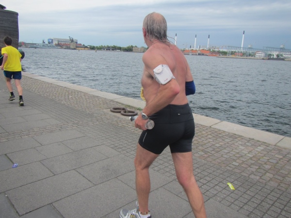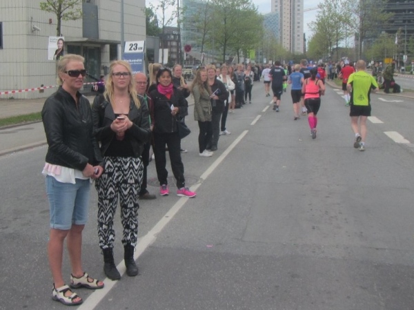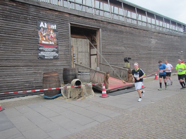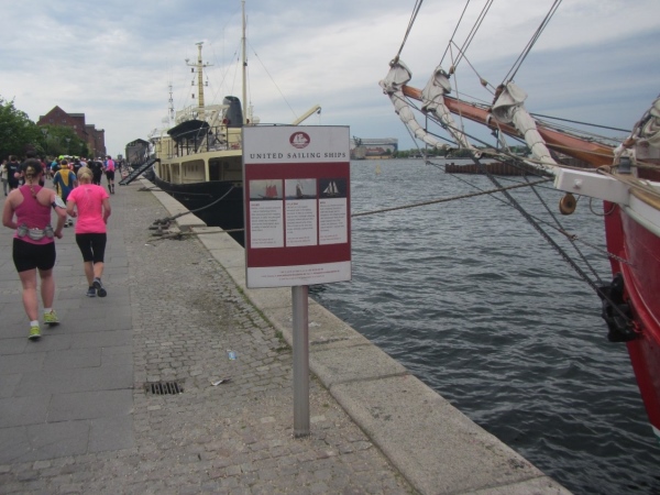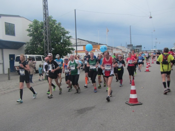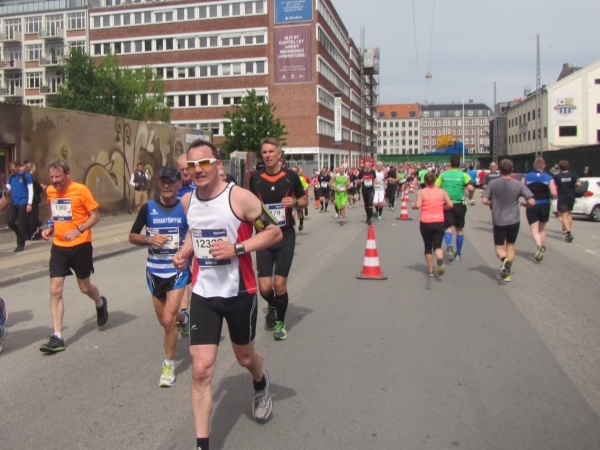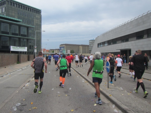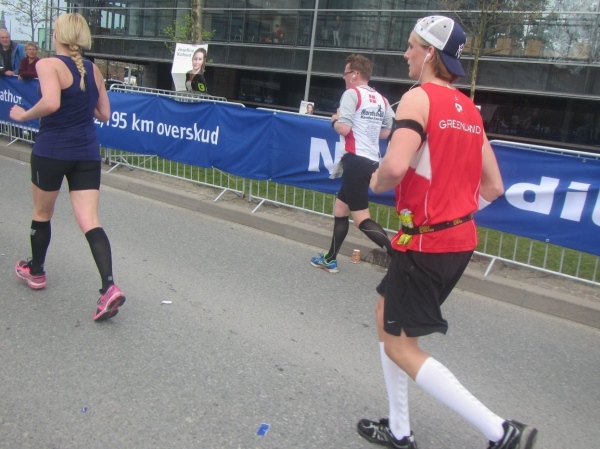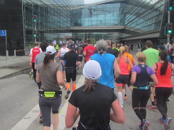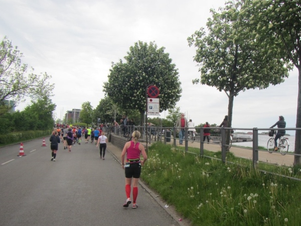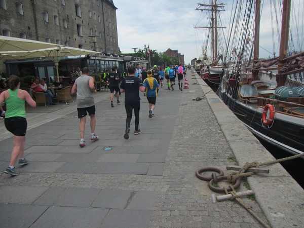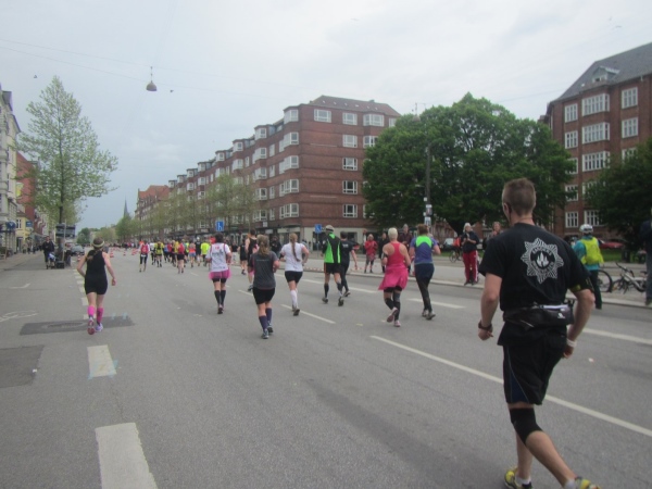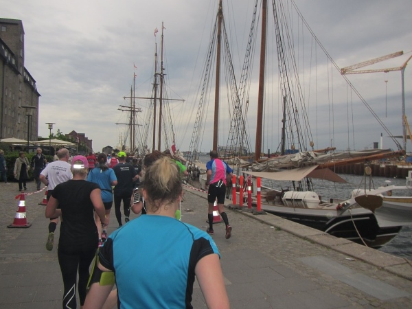 Nun sind es wir, die den noch langsameren Läufern auf der Gegenseite ins Auge blicken können. Allerdings ist deren Zahl deutlich weniger als vorhin. Nach der Dybbølsbro dreht der Kurs von Ost auf Nord. Wir laufen nahe dem Wasser entlang. Einige Läufer wirken nun schon ziemlich erschöpft, obwohl erst 23 Kilometer zurückgelegt sind. Von hinten nach kommt die 4:20er-Läufergruppe, deren Tempo mir unglaublich schnell erscheint.