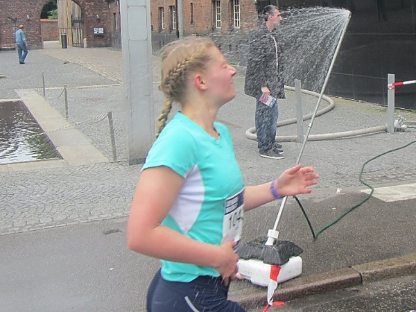 Ich überhole eine jüngere Läuferin, die am Shirt folgende Aufschrift hat: „Don’t mess with a woman who is a marathon runner!“ Ich bin fast geneigt sie anzusprechen und ihr zu sagen, dass der Zusatz „who finishes“ eigentlich noch Platz am Shirt hätte.
