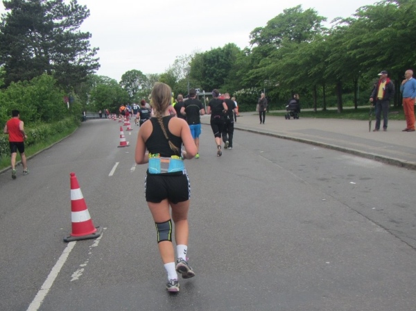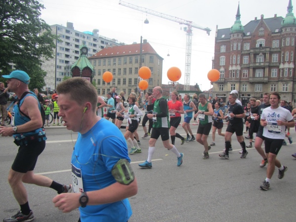 Entlang der Østerbrogade geht es um 180 Grad gedreht wieder zurück bis zur Østeralle, auf der wir schon bei Kilometer 7 gelaufen sind. Jetzt kommt die 4:30er-Laufgruppe von hinten nach. Keine Frage, es wird nicht mehr lange dauern, bis vielleicht auch die 4:50er heranrücken werden. Es erscheint mir zwar verlockend, das Tempo mitzugehen, aber ganz so sicher bin ich mir nicht, es durchzuhalten. Ich werde mir eine Zeit unter 4:30, vielleicht 4:20 für den Herbst aufheben.