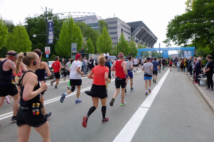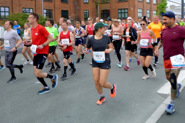Mit der Metro ist man schnell am Hafen. Dort befindet sich, etwas außerhalb des Zentrums, der Start- und Zielbereich. Alles ist gut ausgeschildert und organisiert. Lediglich die Anzahl der mobilen Toiletten, die hier direkt am Startkanal liegen, lässt zu wünschen übrig. Stoisch stelle ich mich in eine ordentliche Schlange und höre vom Häuschen aus den Startschuss. Nachdem ich das WC verlassen habe, kommen die Pacer mit den Vier-Stunden-Ballons vorbei. Glück gehabt.