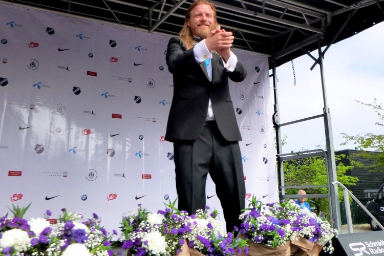 An den Straßenlampen wird das Pokalfinale am 17.5. beworben. Mette sieht meinen fragenden Blick und erklärt, dass nach einem 1:1 in der Verlängerung der FC Midtjylland gegen Brøndby IF mit 4:3 im Elfmeterschießen gewann. Und dann ist sie schon auf und davon.
