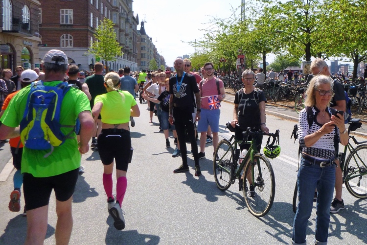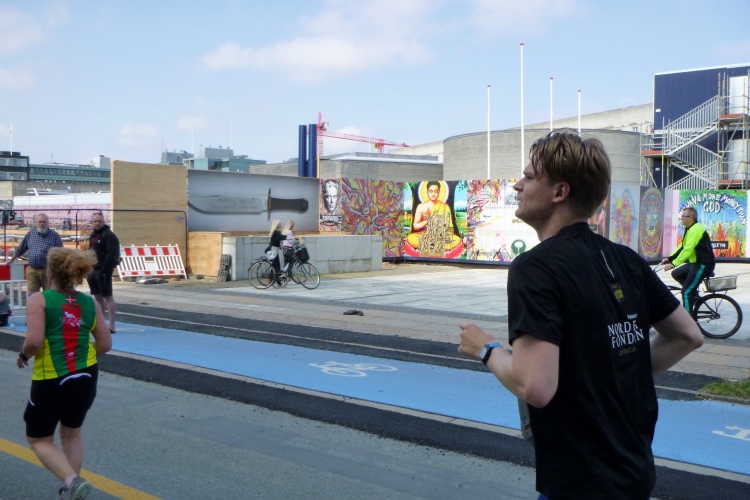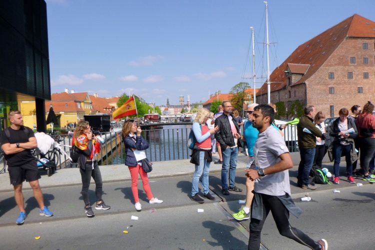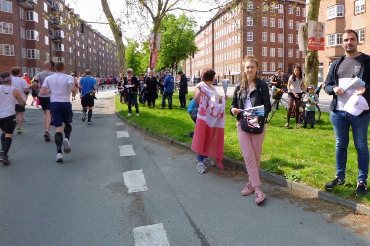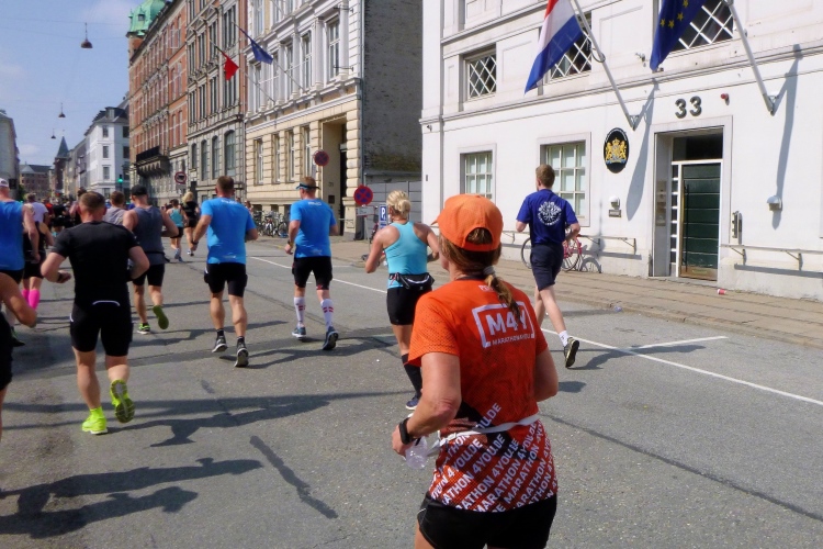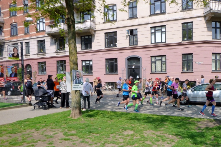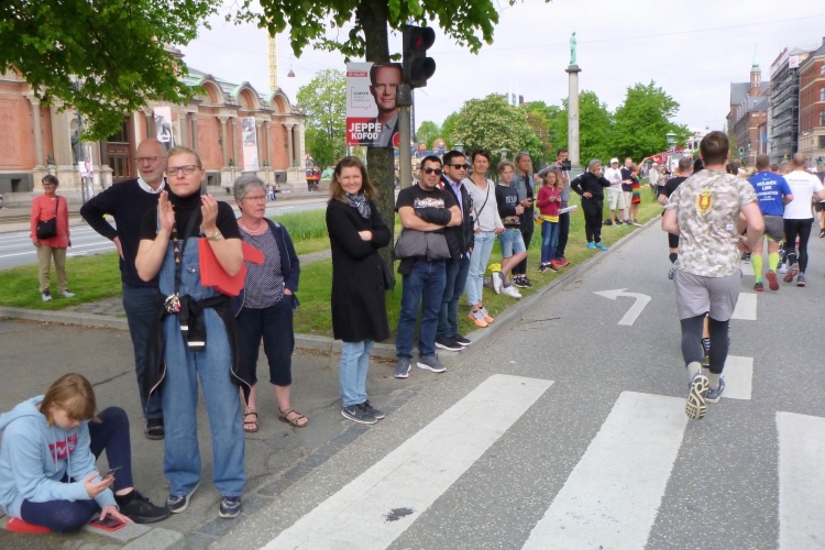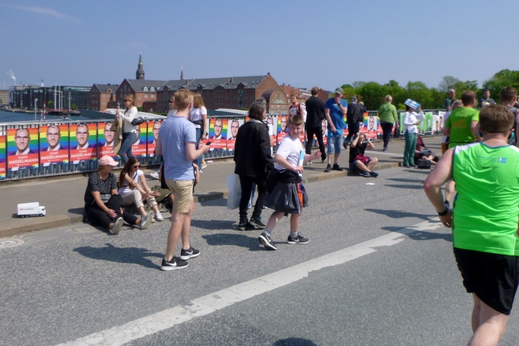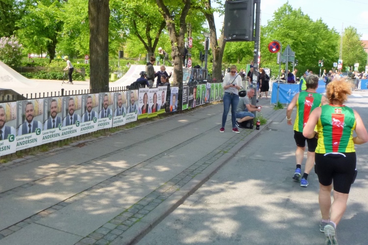 Elke und Mike haben ihre zahlreichen Marathon-Teilnahmen auf den Laufhemden dokumentiert. Wir sind ihnen schon 2018 in Amsterdam begegnet. Einige große Stadtmarathons sind seitdem hinzugekommen. Und die Deutschland- und Europafahne ist auch dabei. Ja, die Europawahl steht vor der Tür. Viele Plakate gibt es zu sehen. Aber es werden immer nur der Name des Kandidaten und die Liste genannt. Bei den „Radikalen“ sind auch viele Zuwanderer zu sehen. Ansonsten wird Europa nirgends erwähnt. Und die einzigen Europafahnen sieht man an den vielen Botschaften aus EU-Länder, an denen wir vorbei kommen. Die schon wohlbekannte Liebe der Dänen zu ihrem Land und zur dänischen Fahne wird bei diesem Lauf wieder sehr oft dokumentiert. Auf der Marathon-Expo gab es auch einen großen Stand mit den weiß-roten Hemden, die man weltweit oft sieht.