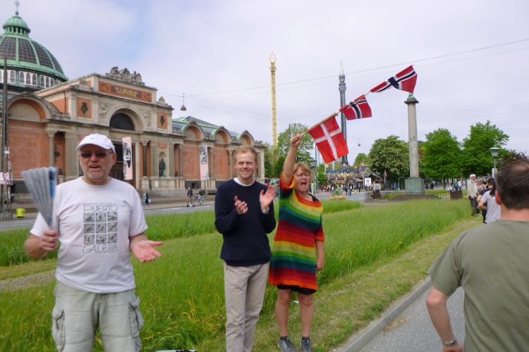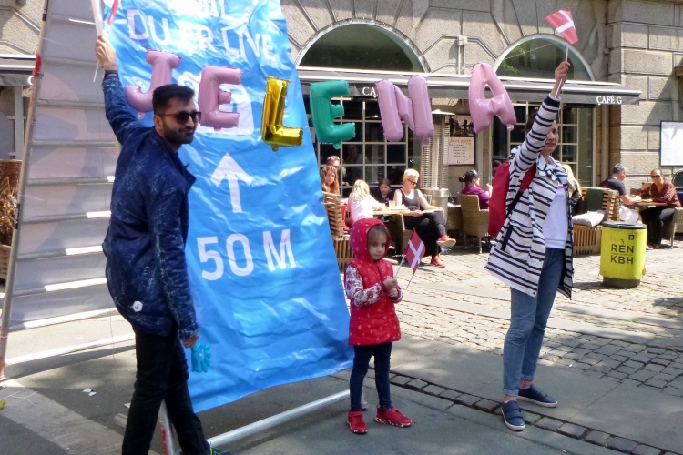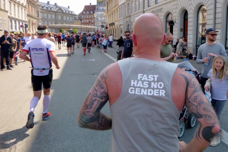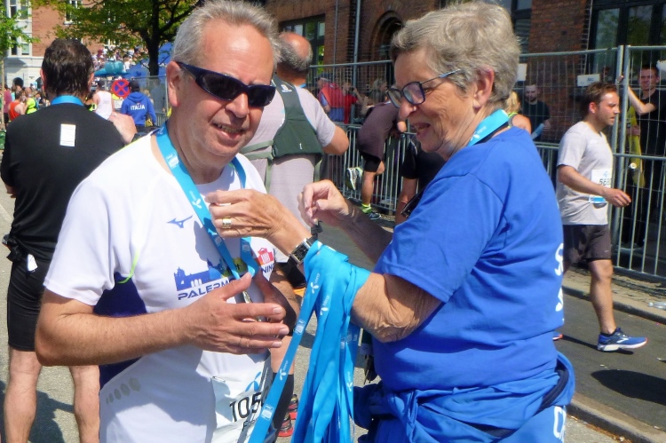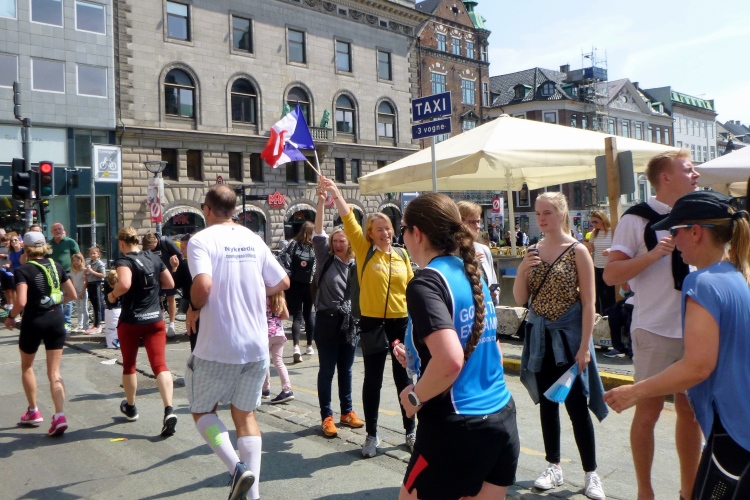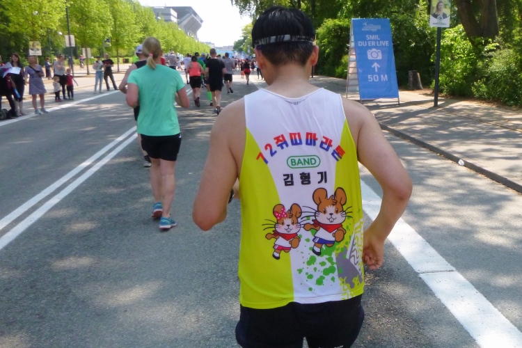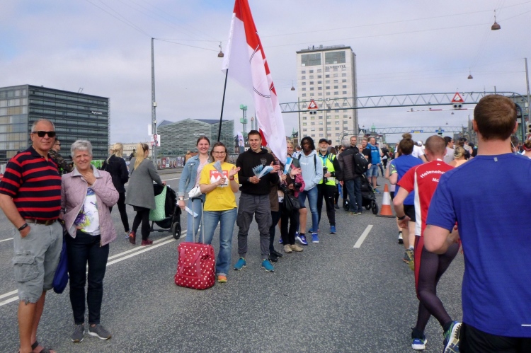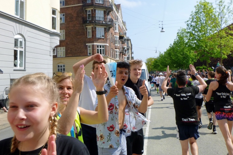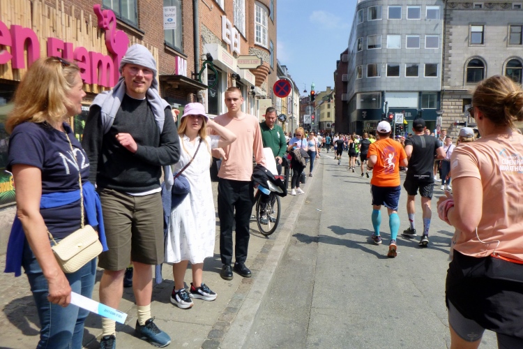 Elke und Mike haben ihre zahlreichen Marathon-Teilnahmen auf den Laufhemden dokumentiert. Wir sind ihnen schon 2018 in Amsterdam begegnet. Einige große Stadtmarathons sind seitdem hinzugekommen. Und die Deutschland- und Europafahne ist auch dabei. Ja, die Europawahl steht vor der Tür. Viele Plakate gibt es zu sehen. Aber es werden immer nur der Name des Kandidaten und die Liste genannt. Bei den „Radikalen“ sind auch viele Zuwanderer zu sehen. Ansonsten wird Europa nirgends erwähnt. Und die einzigen Europafahnen sieht man an den vielen Botschaften aus EU-Länder, an denen wir vorbei kommen. Die schon wohlbekannte Liebe der Dänen zu ihrem Land und zur dänischen Fahne wird bei diesem Lauf wieder sehr oft dokumentiert. Auf der Marathon-Expo gab es auch einen großen Stand mit den weiß-roten Hemden, die man weltweit oft sieht.