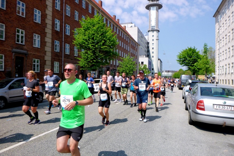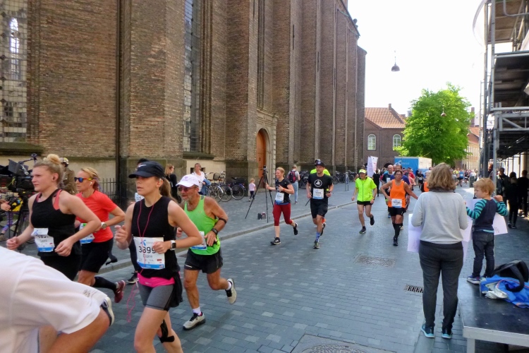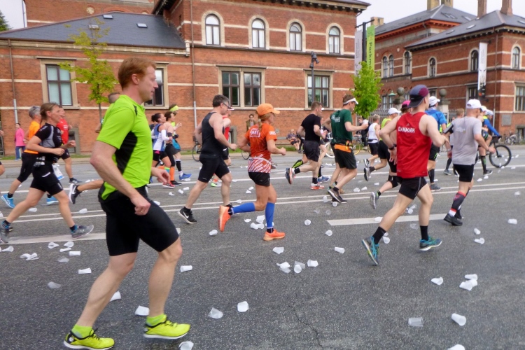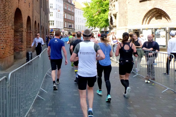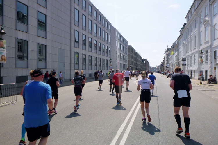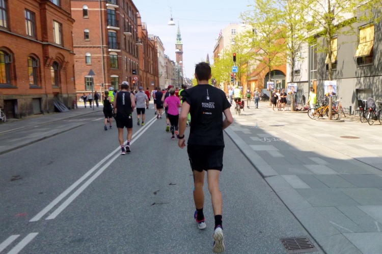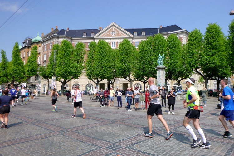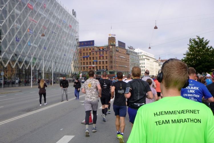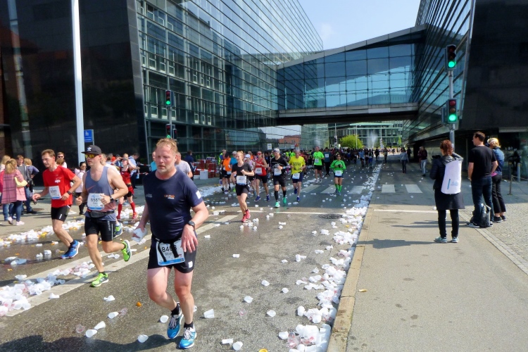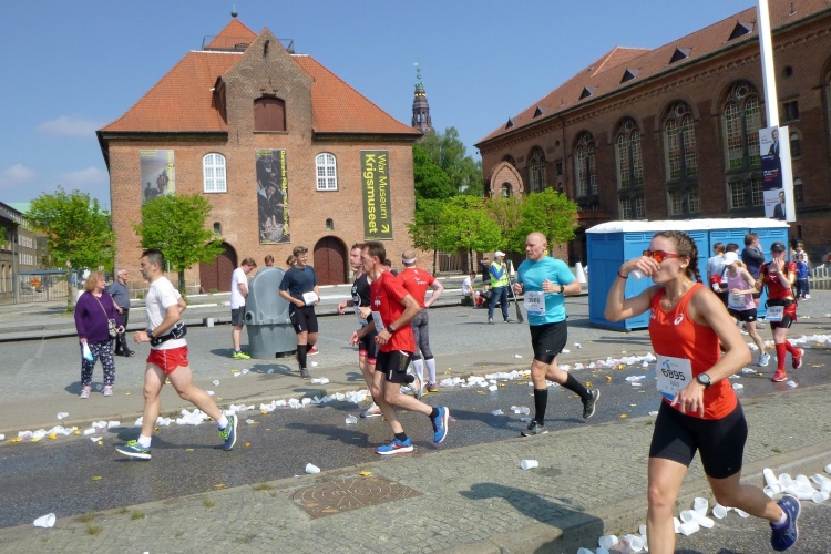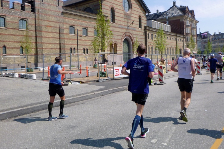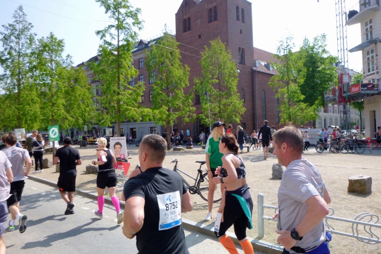 Zweimal um 90 Grad abbiegen. Der Lauffluss ist wegen der Masse der Sportler etwas eingedämmt. Dann sind wir wieder auf einer breiten Allee. Hinter den vielen Dächern der Station Nørreport, die auch einen unterirdischen Bahnhof für Zug, S-Bahn und Metro markieren, die erste Verpflegungsstelle.