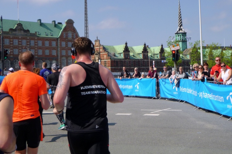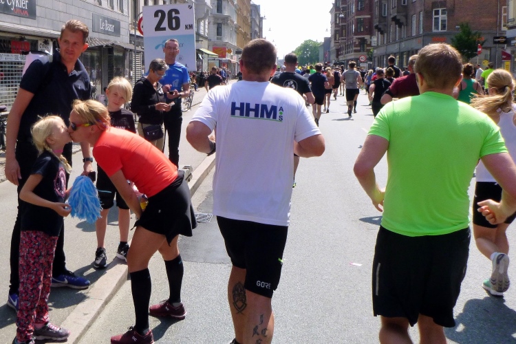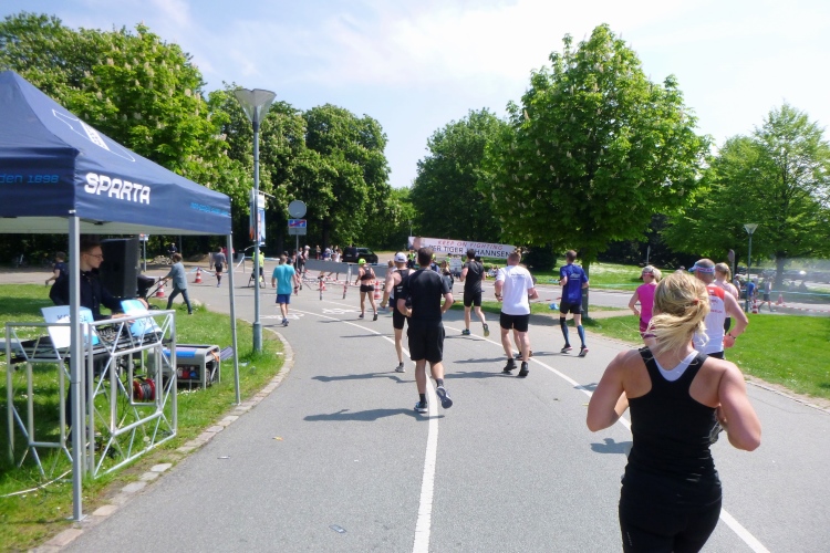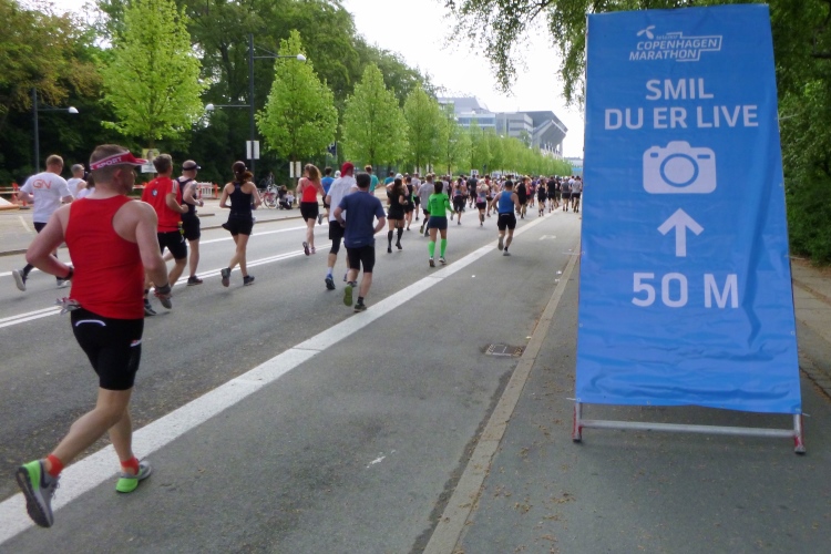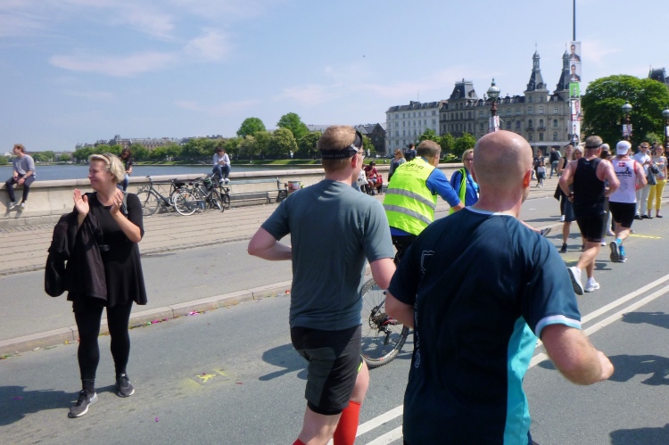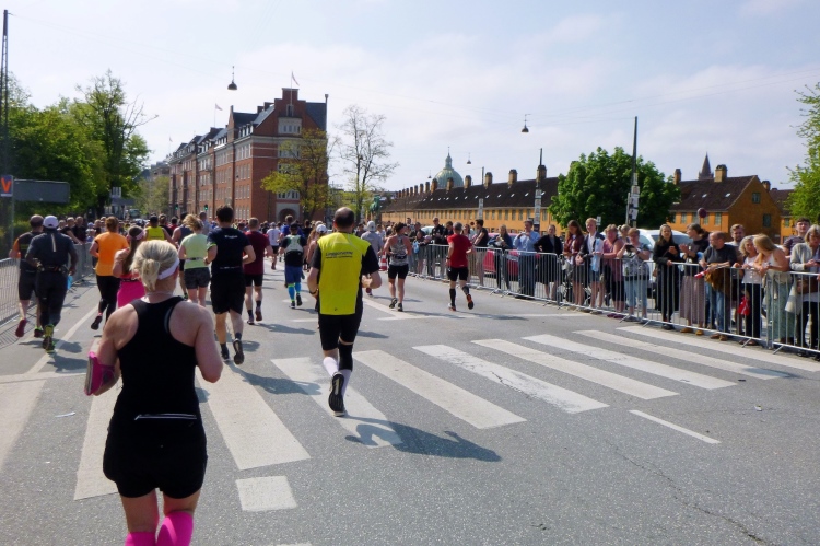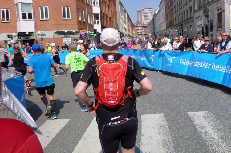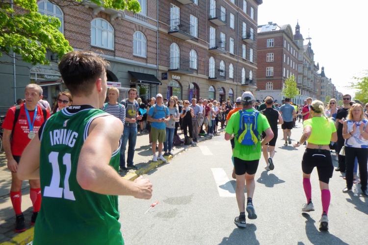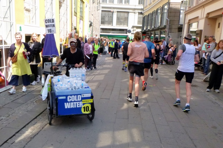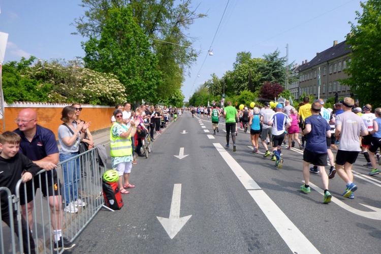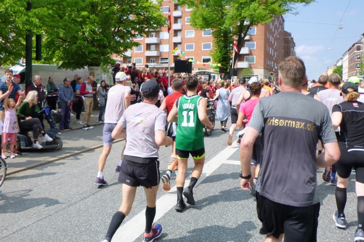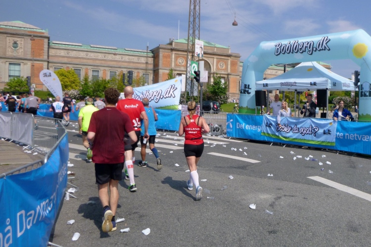 Zweimal um 90 Grad abbiegen. Der Lauffluss ist wegen der Masse der Sportler etwas eingedämmt. Dann sind wir wieder auf einer breiten Allee. Hinter den vielen Dächern der Station Nørreport, die auch einen unterirdischen Bahnhof für Zug, S-Bahn und Metro markieren, die erste Verpflegungsstelle.