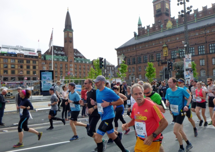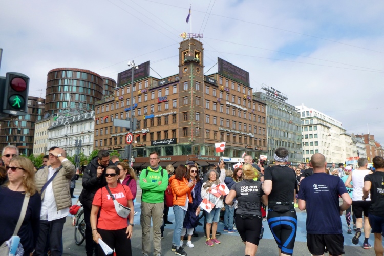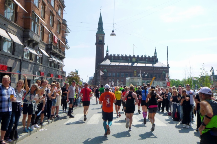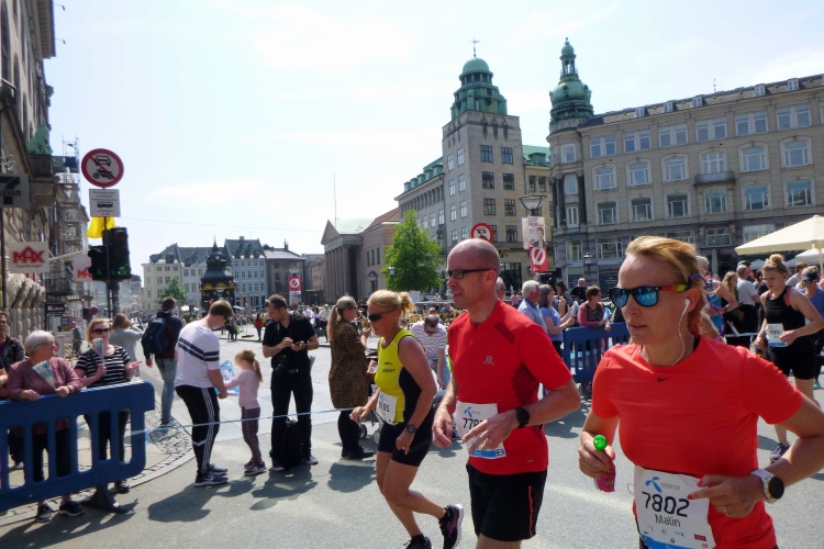 Mir ist heiß. Lange schwarze Strümpfe und Halstuch waren offenbar nicht die richtige Kleiderwahl. Dafür habe ich Judith wiedergefunden, die sich nicht bei den Toiletten anstellen wollte. Noch mal so ein Wunder bei einem Lauf dieser Größenordnung. Rechts geht es am Rådhusplads vorbei. Das im Jahr 1905 fertiggestellte Rathaus liegt quasi hinter uns. 1992 wurde dort die dänische Elf als Fußballeuropameister auf dem Balkon empfangen. Das Glockenspiel, welches um 12:00 Uhr erklingt, wird im Radio übertragen.