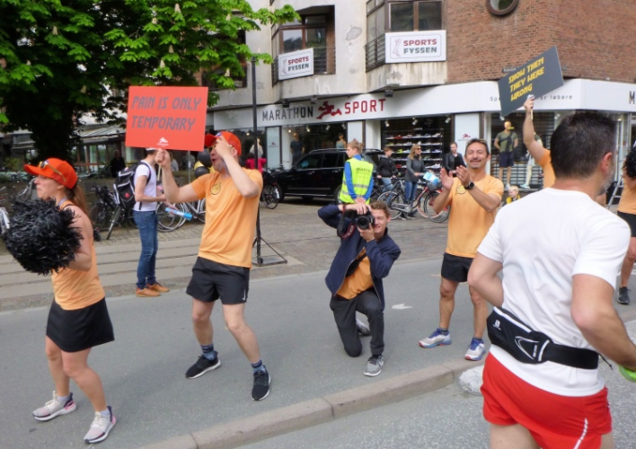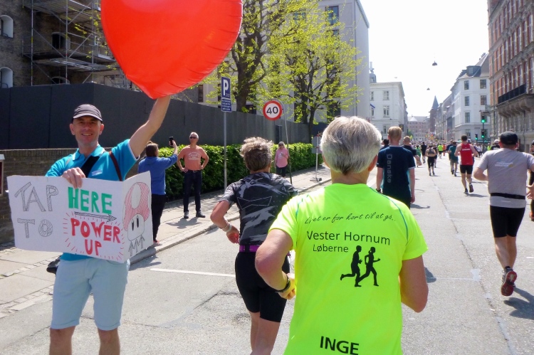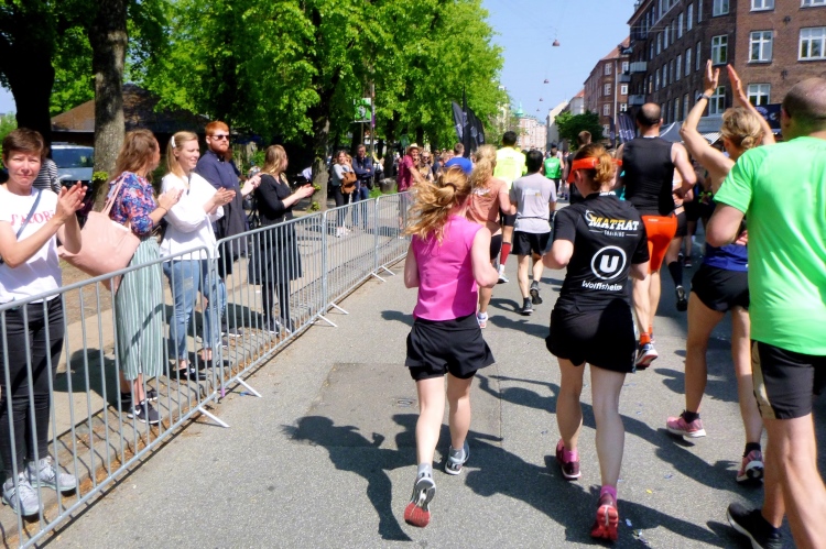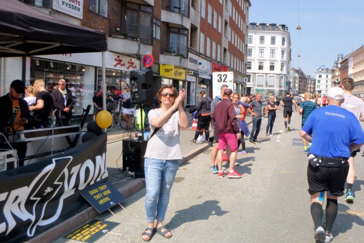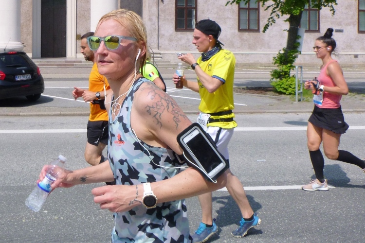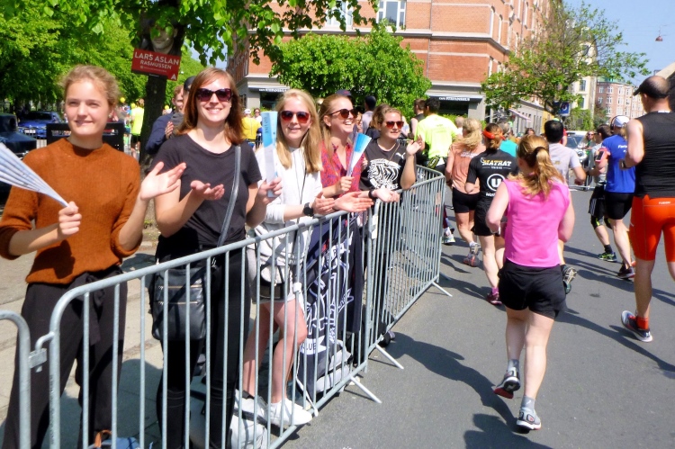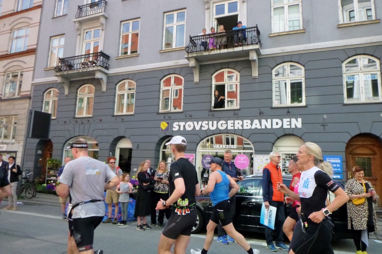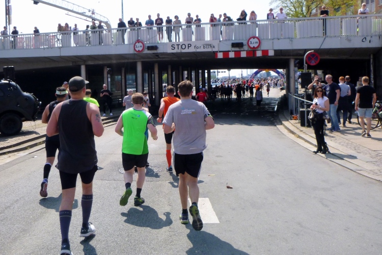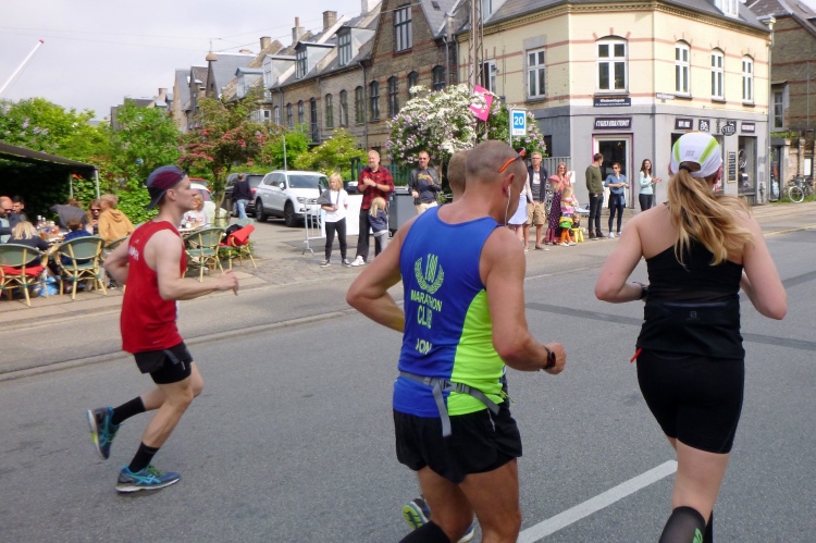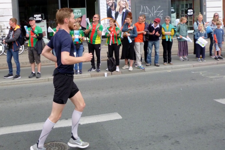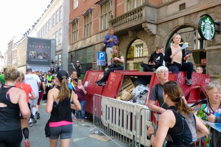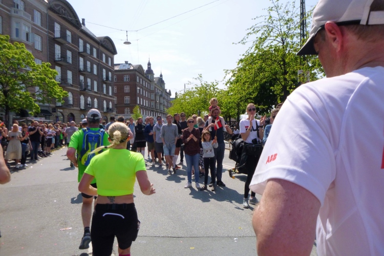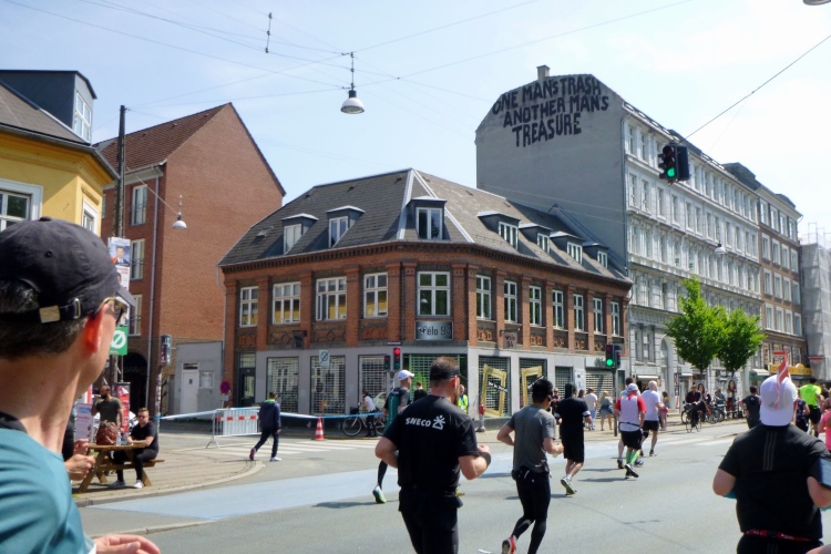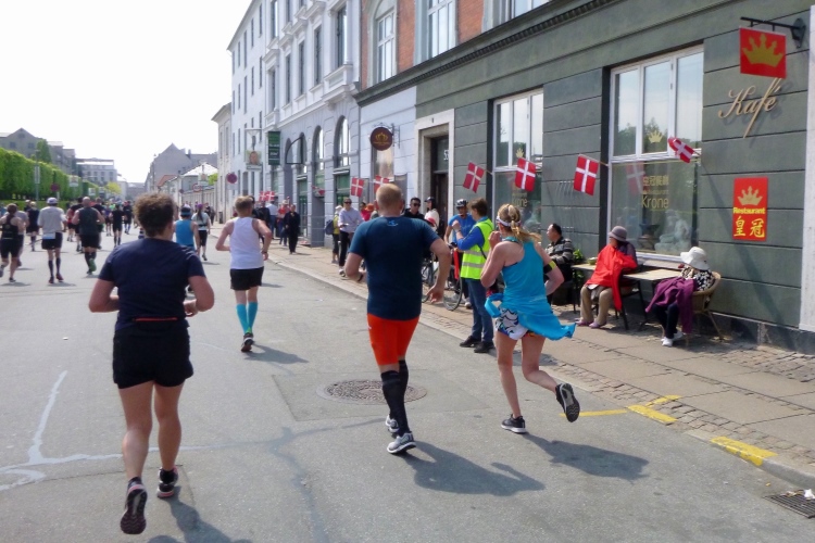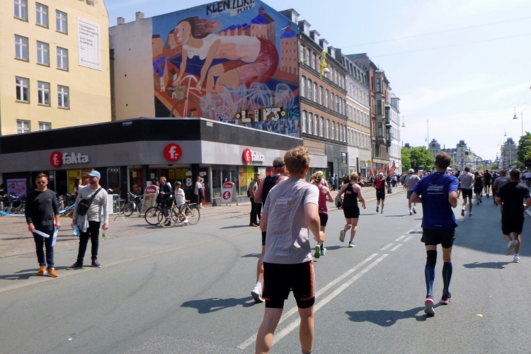 Kilometer 14, unter der Brücke zum Ziel kommen wir in eine ganz moderne Gegend. Der folgende Kilometer auf einer breiten sonnigen Ausfallstraße ist dann auch schnell vorbei. Auf der Brücke über die Eisenbahn beginnt das Halligalli von Neuem. Wir sind im Viertel Vesterbro. Auf dem Sønder Boulevard mit seinem breiten Grünstreifen gibt es eine genau einen Kilometer lange Begegnungsstelle. Stimmung pur, aber wenig Platz zum Laufen. Der Nörgler in mir fragt sich, warum man kein Parkverbot ausgesprochen hat. An der nächsten Verpflegungsstelle, hier Forplejningszone genannt, nutzen wir erst mal die Toilettenhäuschen. Hier gibt es auch ein Café mit dem Namen 42. Ich habe keine Zeit, der Zuschauerin zu erklären, warum ich das fotografieren muss. Der Anblick der hübschen Mädels bringt mich ins Trudeln. Ich habe glatt die Aufpflasterung übersehen. Ich kann mich fangen, ohne auf die Hilfe der Damen angewiesen zu sein.