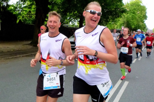 Am meisten beeindruckt mich, dass immer noch so viele Sportler mit mir kämpfen. Judith und ich wechseln uns mit der Führungsarbeit ab. Ich sehe bekannte Zuschauer wieder. Nicht, weil ich die über 100.000 Personen am Wegesrand auseinanderhalten kann. Aber die Schilder. So das „Run now – wine later“, was wohl ein Wortspiel sein soll. Übersetzt bedeutet es, dass einen nach der Anstrengung die Belohnung in Form eines Glases oder gar einer Flasche Wein erwartet. Während das ähnliche „Run now, whine later“ die Aufforderung enthält, jetzt gefälligst zu laufen und das Jammern auf später zu verschieben.