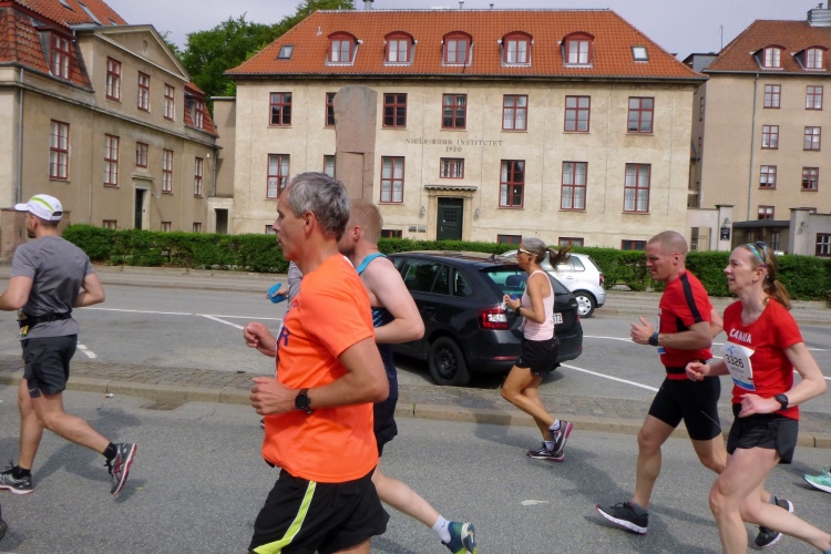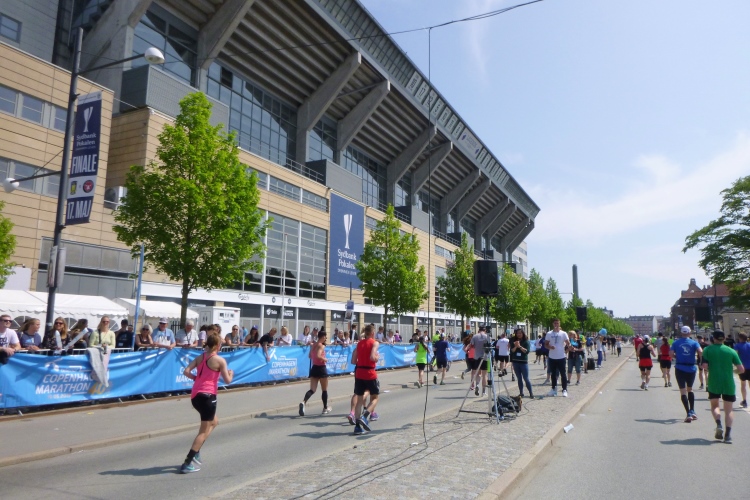 An einem See der ehemaligen Stadtbefestigungsanlage geht es ins Uni-Viertel. Ein beeindruckendes Gebäude mit riesigen Säulen rechter Hand beherbergt den Dänischen Freimaurerorden. Dann ein Haus mit dem Namen „Niels Bohr Institut 1920“. 1922 erhielt der Kopenhagener den Physik-Nobelpreis für sein Atommodell. Bei einem nächtlichen Spaziergang im Fælledparken entwickelte Werner Heisenberg, der im Niels-Bohr-Institut zu Gast war, 1927 die entscheidende Idee für seine Unschärferelation. Auf uns warten eine Band in einem Lkw-Aufleger und eine große Verpflegungsstelle. Die Strecke im Park misst nur einen Kilometer, ein großes Gebäude mit Zuschauertribünen auf dem Dach erweist sich als „Telia Parken“. Kein Parkhaus, sondern ein Fußballstadion für fast 40.000 Zuschauer. Davor eine große Power Zone des Marathon-Sponsors Telenor.