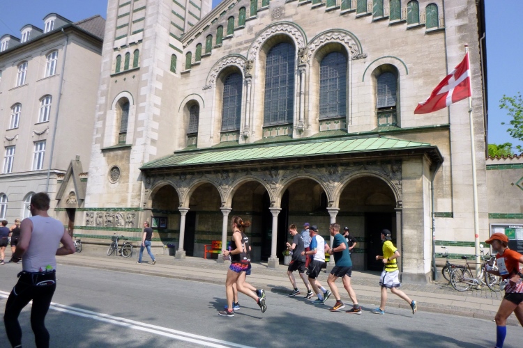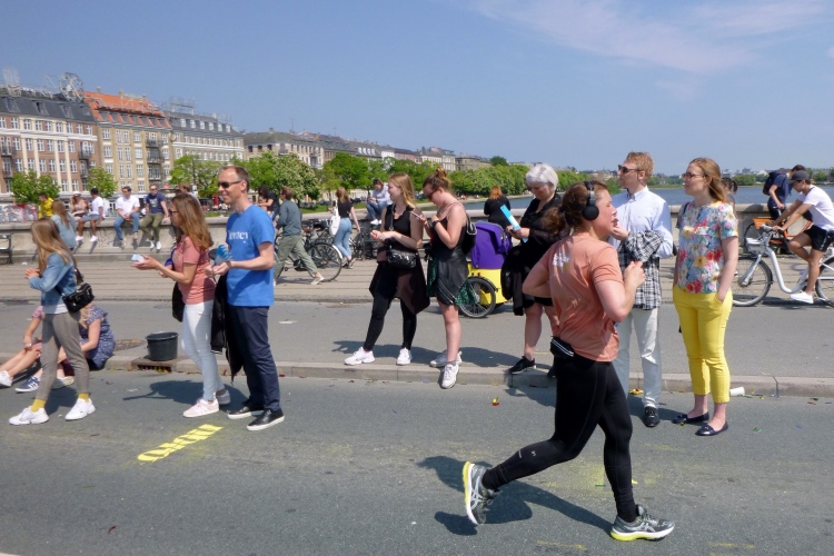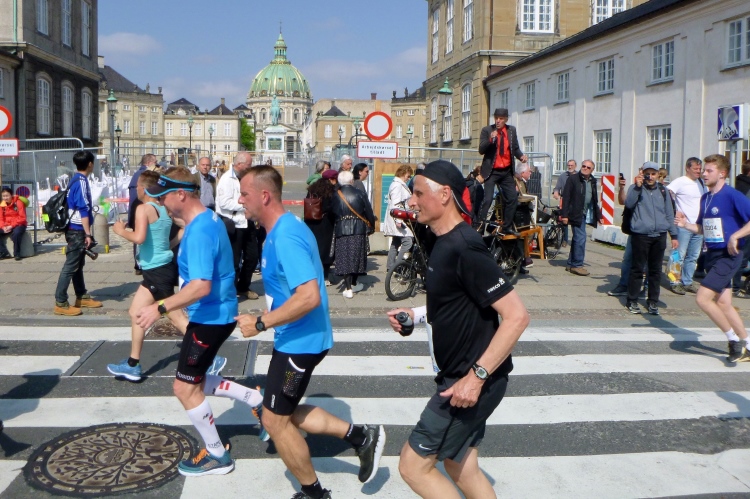 Und dann wieder rein ins pralle Stadtleben. Wie oft am heutigen Tag großer Zuspruch von unzähligen Zuschauern vor einer beeindruckenden Kulisse von Häusern aus der Gründerzeit. Ich bin restlos begeistert. Auf dem Strandboulevarden wieder eine ganz andere Stimmung. Siedlungsanlagen, vor der irischen Botschaft hätte ich eine Gruppe im Stil von Riverdance erwartet. Über eine Fußgängerbrücke queren wir die Ringbahnanlagen. Die Brücke ist stabil, da wackelt nichts, aber ein leises Quietschen verrät die Belastung. Rechts unten die Läuferschar nach dem Verpflegungspunkt. Was man nicht sieht, sind die nahen Hafenanlagen und die Kleine Meerjungfrau sowie die Festungsanlage Kastellet. Dafür die Svenska Kyrkan. Anscheinend brauchen die Schweden ihre eigene Kirche. Am Grün des Festungswassergrabens vorbei und dann auf die Amaligade direkt auf den Königlichen Palast zu. Kurz davor schwenken wir jedoch an den Hafen. Ein Blick auf die Marmorkirche rechts und das moderne Opernhaus auf der anderen Hafenseite. Ein Windjammer der US-Küstenwache liegt hier vor Anker.