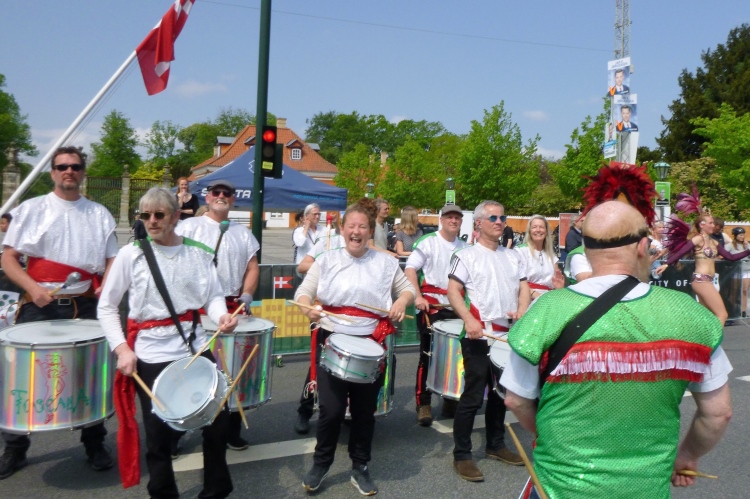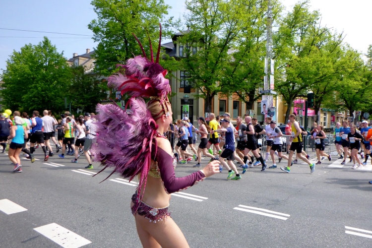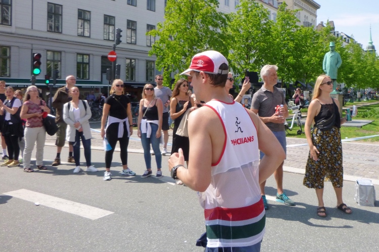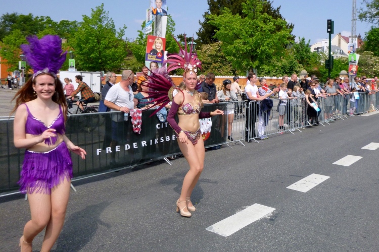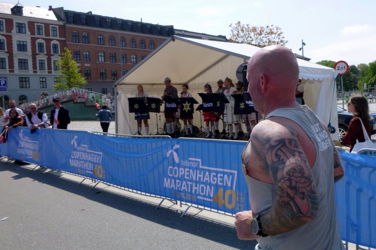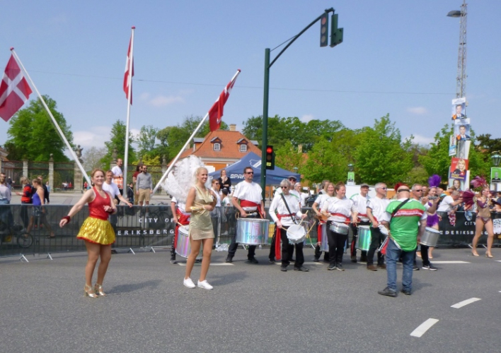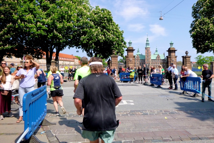 Vor uns die ehemalige Sommerresidenz der dänischen Könige, errichtet für Friedrich IV und heute Sitz einer Militärakademie. Frederiksberg liegt auf einem Hügel und so erreichen wir hier die höchste Stelle des Kurses. Das Gebäude in einem noch größeren Park sehen wir nicht, dafür aber die Damen der Sambaband in einer der Temperatur angepassten Aufmachung. Die Pacer für 4:20 stehen am Straßenrand, die Band gegenüber macht auch Pause.