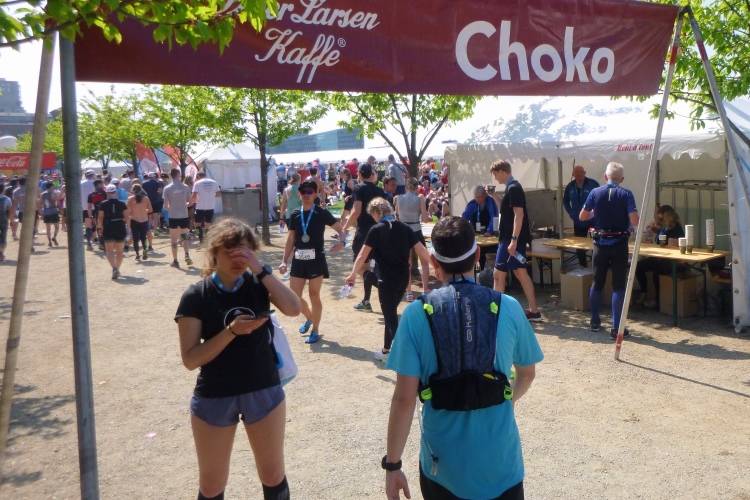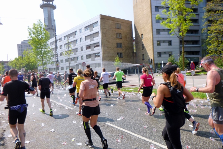 Inzwischen habe ich auch mein Vorgehen an den relativ kurzen, nur auf einer Seite angebrachten Verpflegungsstellen optimiert. 1. Peile das Schild „Wasser“ oder „Energie“ an. 2. Nimm erst den vollen dritten Tisch ins Visier. 3. Frage nach, was sich im angereichten Becher befindet.