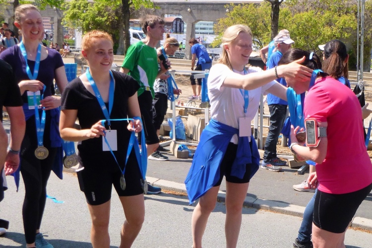 Im Nachzielbereich gibt es verschiedene Getränke, auch alkoholfreies Bier aus der Gegend von München, Obst und Gebäck. Die Duschzelte sind ausreichend groß, das Wasser warm. Die Wiese am Hafenbecken bietet sich zum Verweilen bestens an. Verwegene nutzen die Badestellen für ein gesundes Abkühlen in der gut 10 Grad kalten Ostsee.
