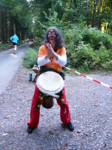 Die ersten beiden Kilometer wurden wir entlang weiter Felder geführt, die einen ersten Blick in das Kraichtal ermöglichten. Nach der ersten Verpflegungsstelle ging es im Wald zunächst leicht wellig, bevor ein erster steiler Anstieg den Vorwärtsdrang der Läufer bremste. Den richtigen Laufrhythmus bekamen wir wieder durch eine Bongospielerin kurz vor dem Kulminationspunkt der Steigung.
