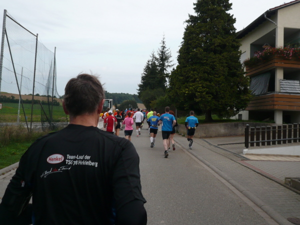 Kurz nach dem Start werden wir musikalisch von den Rohrbacher Bruchbatschern hinausbegleitet. Von Beginn an führt der Lauf zunächst sanft ansteigend auf die Höhen des Kraichgaus. Nach einem Rechtsknick folgt der erste kurze, aber knackige Anstieg, ehe die erste Verpflegungsstelle auf uns wartet. Mit Sägemehl-Pfeilen und gut sichtbaren, wechselbaren Schildern, aber auch mit aufmerksamen Helfern wird jedem Läufer der richtige Weg gewiesen. Denn je nach Distanz müssen die Läufer an den neuralgischen Punkten in unterschiedliche Richtungen abbiegen. Diese Markierung und auch die Helfer sorgen dafür, dass ein Verlaufen nahezu unmöglich ist. Hut ab vor dieser Leistung.