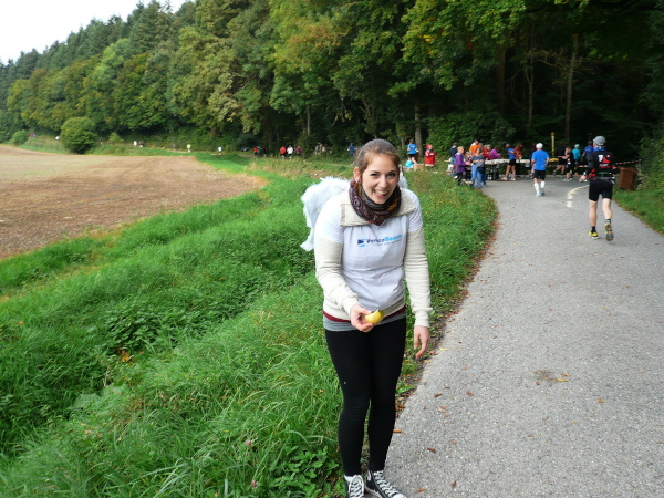 Mir kommen die vor mir laufenden Ultras entgegen und gegenseitig feuern wir uns an. So sind halt Ultras. Nach einem welligen Abschnitt geht es nach einem Rechtsknick wieder den Berg abwärts. Wir befinden uns auf der ehemaligen Begegnungsstrecke mit den 10km-Läufer, nur folgen wir diesmal deren Kurs bergabwärts. Im Tal angekommen, erreiche ich wieder die Verpflegungsstelle mit einigen unerschütterlichen Helfern, die für eine ausreichende Verpflegung sorgen. Als nächstes steht wieder der Single-Trail auf dem Plan, diesmal in umgekehrter Richtung. Und das Beste: Ich habe ihn ganz für mich alleine.