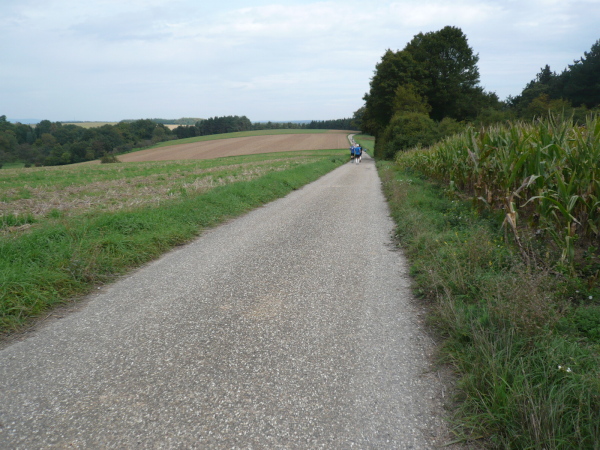 Der Anstieg wird steiler, nachdem wir die Begegnungsstrecke nach links verlassen. Auch so mancher Halbmarathoni verfällt hier in den Wanderschritt. Wir erklimmen beinahe wieder die Höhen rund um Sinsheim, als es wieder nach unten geht. Wie gewonnen, so zerronnen. Und zum Dank dafür dürfen wir die verlorenen Höhenmeter gleich wieder zurückerkämpfen. Dieser Kampf gipfelt in der Ankunft der bekannten zugigen Verpflegungsstelle auf der Höhe des Kraichgaus. Und nicht vergessen: Wir kommen hier noch einmal vorbei.