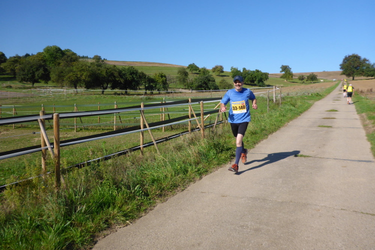 Jetzt geht es auf die Felder. Eine Allee von Streuobstbäumen versucht vergeblich den Wind abzuhalten. Auf der Anhöhe werden wir ganz schön verblasen. Dafür gibt es tolle Aussicht und es wird nicht so warm, obwohl sich die Sonne alle Mühe gibt, uns einzuheizen. Unter uns liegt Neckarbischofsheim. Es geht bergab und wir streifen die äußeren Häuser (km 19). An einem Aussiedlerhof liegt die nächste VP. Schon von weitem erkennen wir, dass uns dort Läufer entgegenkommen. Nach einer kurzen Stärkung geht es erneut bergauf. Die Entgegenkommenden sind uns weit voraus. Wie weit, das wissen wir zu diesem Zeitpunkt allerdings noch nicht. Nach ungefähr 3 Kilometern, an einer Weggabelung steht wieder eine VP. Nun begeben wir uns auf eine Schleife, und dann kommen wir wieder hier vorbei.