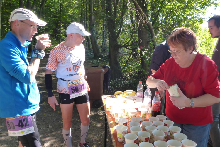 Manchmal sind es die Kleinigkeiten: Schon von weitem werden wir begrüßt „Aah, zwei 50 km Läufer - die kommen zu uns.“ Die VP ist hier nämlich geteilt, ein Teil für die 33 km Läufer und der andere für die Ultras. Nach diesem freundlichen Empfang lassen wir es uns erst einmal schmecken. Die Helfer informieren uns über den weiteren Streckenverlauf. Wir laufen erneut eine Schleife und kommen dann wieder zurück. Ein anderer Ultra ist bereits auf dem Rückweg. Nanu, hat er nicht nur noch 2 km bis ins Ziel? Er trinkt, als gäbe es kein Morgen. Erst später wird mir klar, dass man von hier nicht den direkten Weg ins Ziel nimmt - aber davon später.