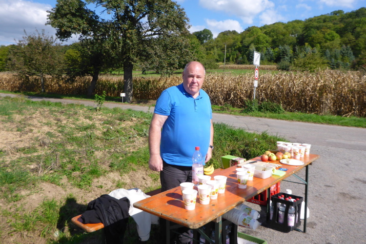 Es geht bis zum Wald bergab, dann ein Stück am Waldrand entlang und anschließend im Wald wieder bergauf. Die ganze Schleife ist damit rund 3 km lang. Wir stärken uns ausgiebig an der VP. Die Letzten sind hier schon durch und so kommt uns nun keiner mehr entgegen, als wir zurücklaufen. Wieder am Aussiedlerhof bei Neckarbischofsheim angekommen, werden wir von den Helferinnen abermals freundlich empfangen. Nach einer kurzen Pause wünscht man uns noch einen schönen Lauf. Dann geht es bei km 27 an Streuobstwiesen vorbei wieder bergauf.