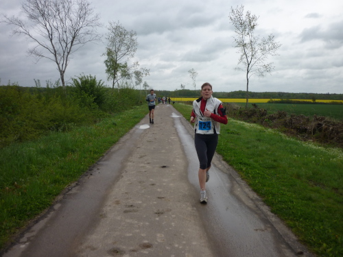 Hier in Kollow biegen wir von der Landstraße nach rechts ab, erreichen wenig später den zweiten, (wie alle anderen auch) hervorragend ausgestatteten Verpflegungspunkt und laufen nun auf einem asphaltierten Wirtschaftsweg, wenig später dann auch teilweise auf unbefestigten Wald- und Feldwegen, an herrlich duftenden Rapsfeldern entlang.
