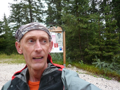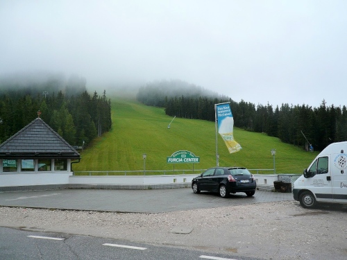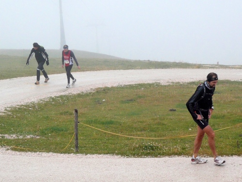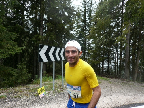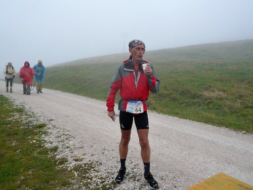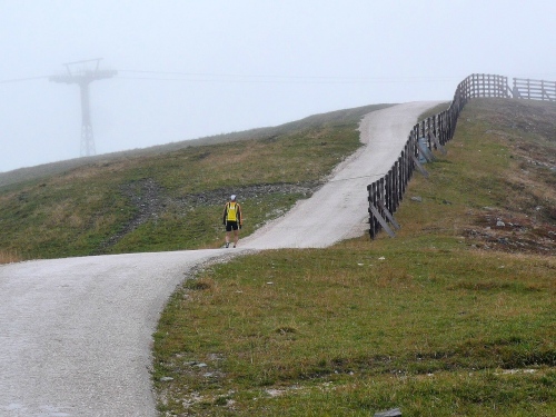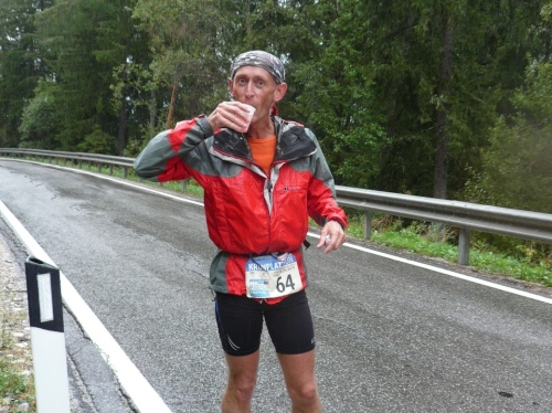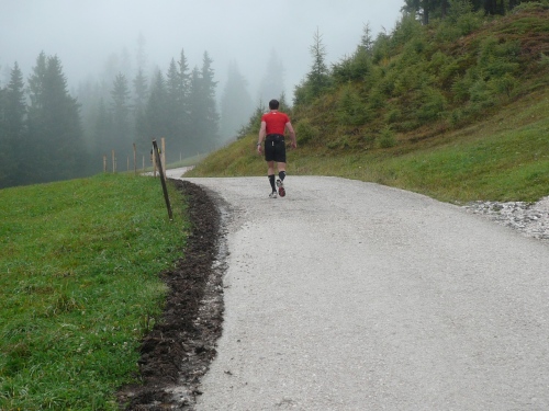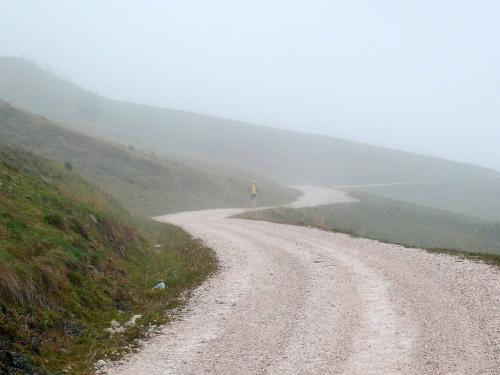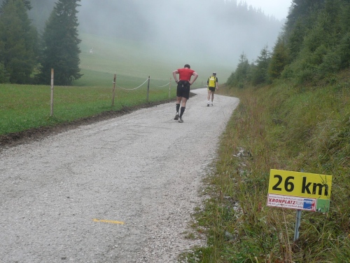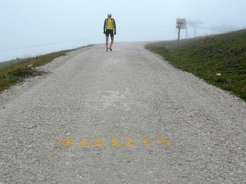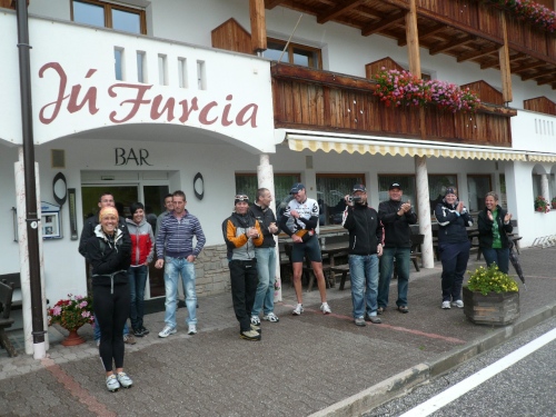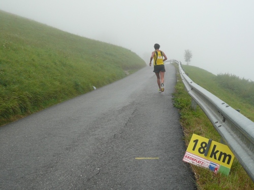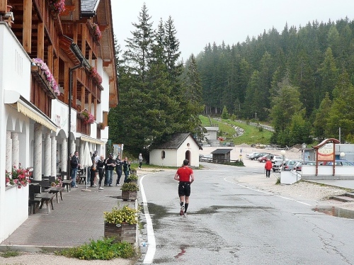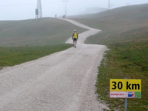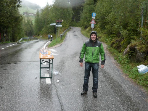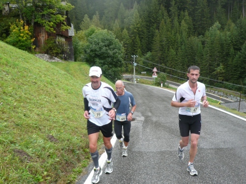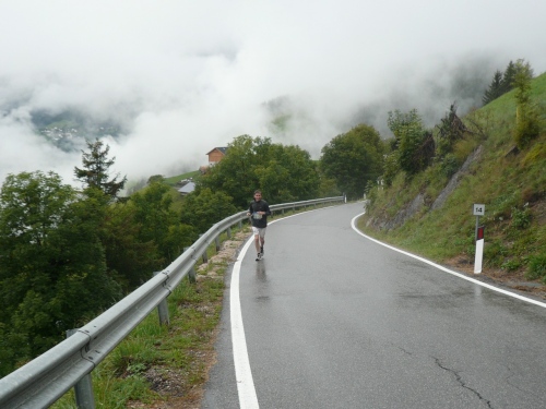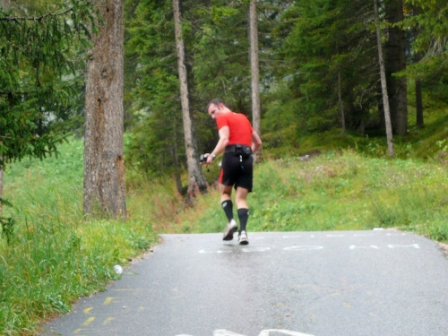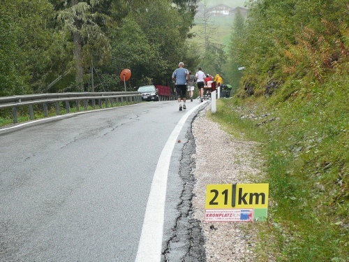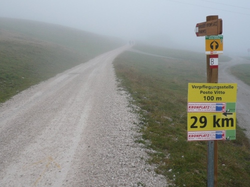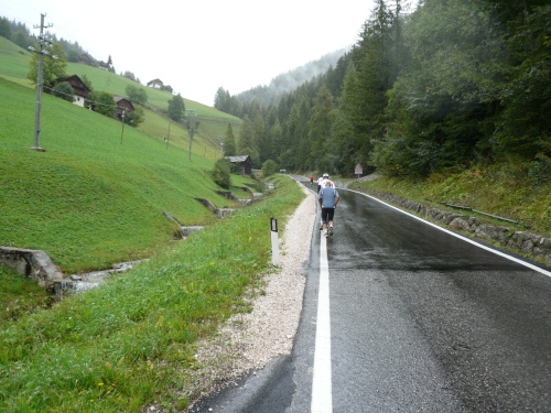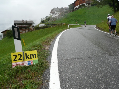 Nach Enneberg beginnt der rund fünf Kilometer lange Anstieg zum Furkelpass. Bei Kilometer 20 bin ich glücklich, dass das Getränk nun angewärmt ist, denn es ist bei dem Nieselregen schon kühl geworden. Am eigentlichen Abzweig zum Furkelpass, eine Spitzkehre, geht es dann richtig zu Sache. Einige marschieren schon, ich kann jedoch gerade noch laufen, die Verfolger sind beim folgenden Fotostopp gleich wieder da. Aber es ist hier nicht ein Kampf Mann gegen Mann, sondern man unterstützt sich gegenseitig.