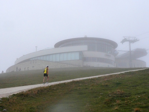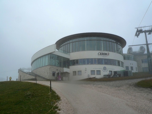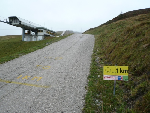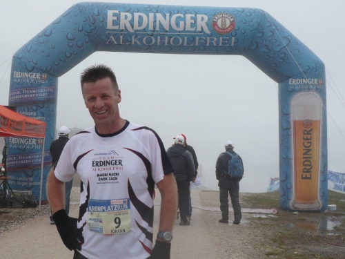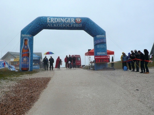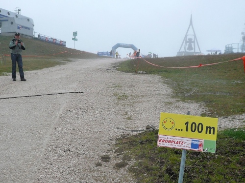 Kilometer 30, noch 600 Meter. Jetzt sind alle 100 Meter markiert. In Laufrichtung sehe ich einen Betonklotz, aus dessen Richtung ich Musik und Lautsprecherdurchsagen höre. Dann führt unser Weg an dem Betonklotz vorbei, der sich jetzt als Restaurant Kron entpuppt. Die letzen Meter gehen dann bis zur höchsten Stelle am Kronplatz auf 2275 Meter. Zieleinlauf unter dem modernen Tor des Erdinger Bierspezialisten. Vor mir sehe ich die Concordia 2000, die Friedensglocke es Künstlers Paul de Doss-Moroder.
