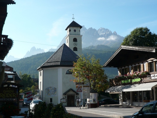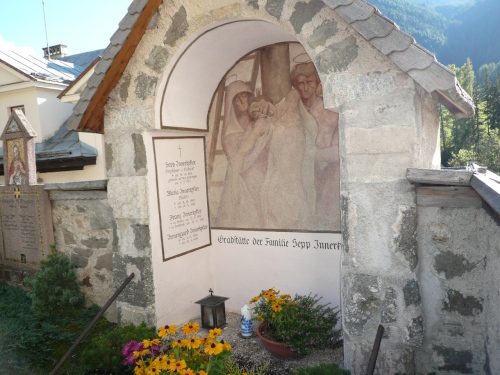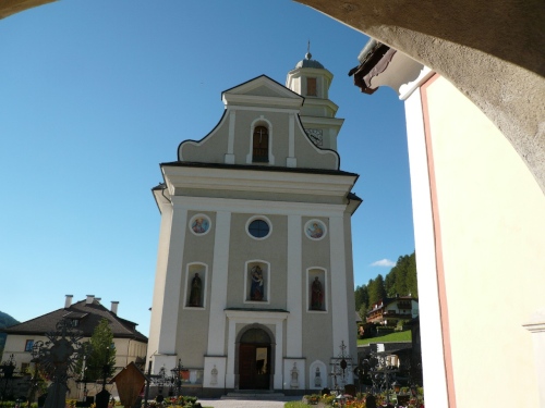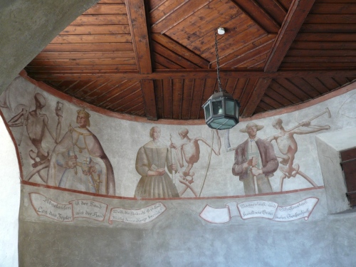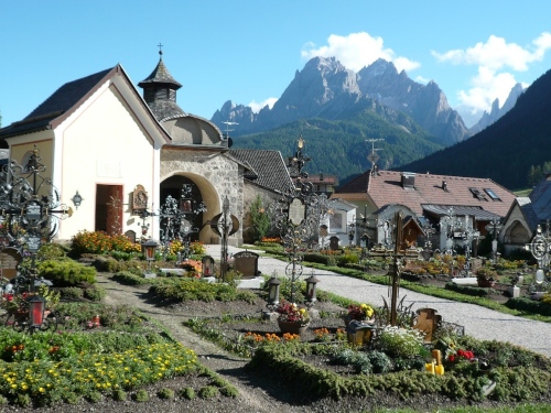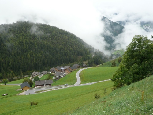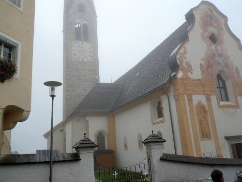 Später kann ich auf Tiziana Pignatelli auflaufen. Die springt mir dann bei jeder Fotoarbeit wieder davon. Enneberg ist der letzte Ort vor dem Funkelpass. Mittlerweile nebelt es gehörig. Keine 100 Meter sind zu sehen. Enneberg ist eine der fünf ladinischen Gemeinden des Gadertales. An der Kirche sind eindrucksvolle Malereien zu sehen. Bis ich wieder zwei, drei Bilder gemacht habe (oder habe ich geschlafen?), ist mir Tiziana auf dem folgenden Gefällestück bestimmt 200 Meter voraus. 19 Kilometer liegen schon hinter uns.