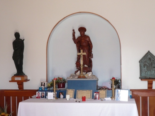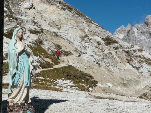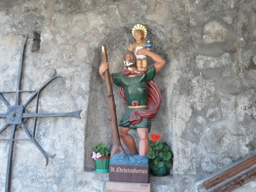 Dann sind wir beide beim Furkelpass auf 1789 Meter angekommen. Aus dem links liegenden Gasthaus sind einige Personen nach draußen gegangen und machen uns Beine für den Endspurt. Die nebenanliegenden Kapelle mit dem aufgemalten Ave Maria holt uns auf den Boden der Realität zurück.