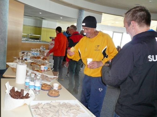 Im Untergeschoss des Restaurants können wir uns umziehen und verpflegen. Neben Iso und Wasser erhalten wir Kuchen, Schokoriegel, Waffeln, Obst. Das Finishershirt gibt es nebenan. Der Bon für die Nudeln kann oben eingelöst werden.