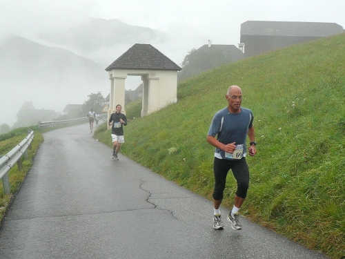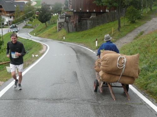 Gerhard Kremer ist ein Landsmann, den es, soweit ich mich erinnern kann, beruflich nach Südtirol verschlagen hat. Immer wieder läuft er auf, dann ist er wieder vorne, dann komme wieder ich von hinten. Jetzt geht es ein paar Kehren auf Almwiesen steil empor. Nur wenige Läufer sind hinter mir zu sehen.
