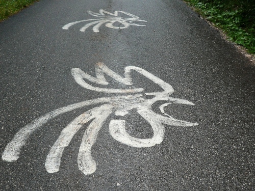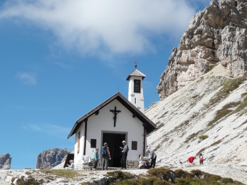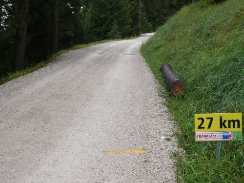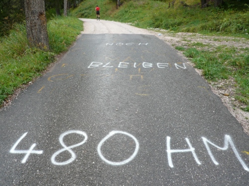 Den letzten Teil der Strecke nehme ich mit einem Schwung in Angriff, doch die Steigung nimmt wieder zu. Auf dem Asphalt sehe ich den Kopf eines Gockels aufgemalt, das Kronplatz-Logo. Und dann lese ich „Noch 480 Höhenmeter!“ Den Spruch, so erfahre ich später, hat am Morgen der Hermann da noch hingemalt. Will er uns da noch mürbe machen? Wenn die Kapelle mit dem Ave Maria nicht wäre, dann hätte ich die Sachsen gerufen.