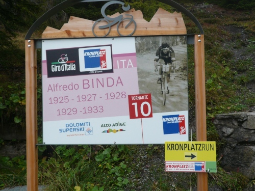 Mit der Marschiererei trifft es mich nun auch. Der Höhepunkt auf dem Weg zum Gipfel sind dann die 13 Spitzkehren. Jede ist mit einem Plakat versehen. Manchmal sind gerade die Kurven sausteil. Am morgigen Renntag können die Biker aufgrund des tiefen Schotters beweisen, dass sie es draufhaben. Die Kehren gehe ich und kann dann wieder ein Schneckenlauftempo aufnehmen. Andreas bleibt mit seiner Kamera zurück.