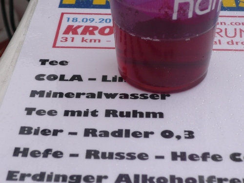 Sieben V-Stellen mit angewärmten Iso, Riegel, Obst. Wasser in Plastikflaschen. Erweiterte Zielverpflegung (Kuchen, Schokoriegel etc.) und Nudelbon für die Siegerehrung