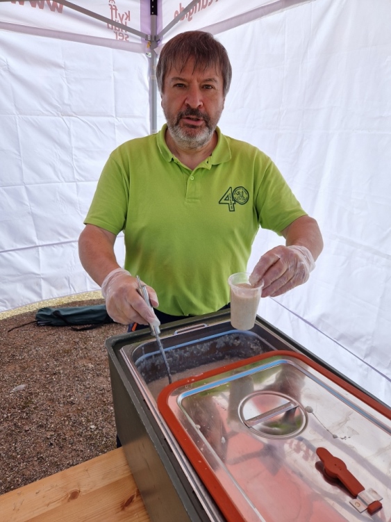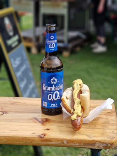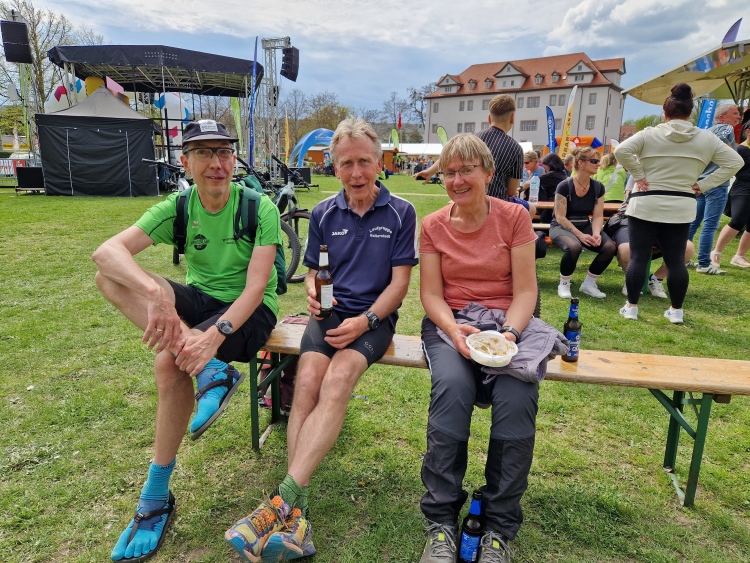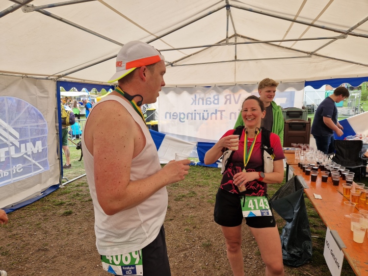 Jetzt im Ziel noch ein paar Iso-Drinks und Salzbrezeln. Ein paar Finisherfotos mit fremden Frauen im Arm. Aber was heißt schon fremd? Das hier sind Berglaufreundinnen, das schweißt zumindest für den Moment fast familiär zusammen. Da sind Anja, Ulrike und Lilly. Alle drei Frauen haben ihre Altersklassen gewonnen, Klasse. Und dann das alkoholfreie Finisherbier abgeholt und die nächste Thüringer Bratwurst frisch vom Grill. Und so mancher Plausch mit neuen und alten Lauffreunden. Natürlich war die Erfurter Lauftruppe beim KBL wieder stark vertreten. Dann kaufe ich am Souvenirstand von Katharina das letzte Finishershirt in Größe L. Na, wenn das nicht passt!