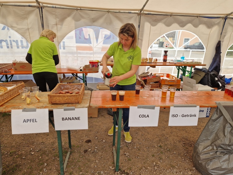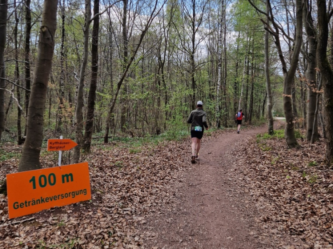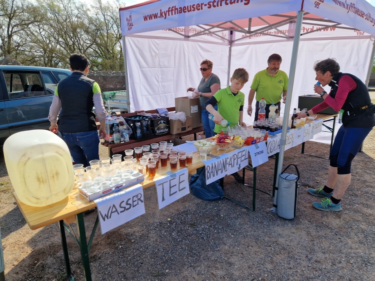 Dann wird es untypisch für einen Berglauf flach bis nur leicht wellig. Zudem ist der Laufuntergrund asphaltiert oder geschottert. Fast zehn Kilometer lang laufen wir so zu Füßen des Kyffhäusers an seinen Nordhängen entlang. Für mich wird es jetzt schon mal einsam. Meine ersteren Mitläufer nutzen das flache Geläuf und nehmen Tempo auf. Ich aber folge meinem Plan und halte mich zurück. Erst in Ichstedt an der Verpflegungsstation bei Kilometer zehn schließen die nächsten Mitläufer zu mir auf. Als Nahrung dienen vor allem Stücke vom Apfel, der Banane, der Zitrone. Auch Salztüten liegen aus und ich bediene mich gern davon.