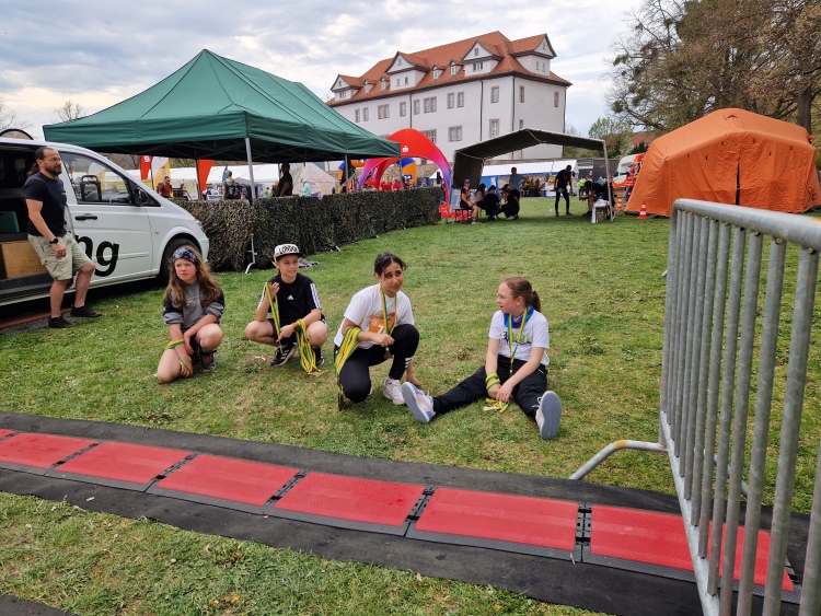 Dann sind wir am Waldrand und am Tilledaler Tor bei der letzten Getränkestelle. Noch ein Schluck Wasser und ein Schluck Cola. Und die Gewissheit: die letzten vier Kilometer läuft es nur noch bergab. Auf einer weißlich blühenden Obstallee kommt das berühmte Panoramamuseum mit dem größten Sinnbildgemälde der Welt (über Thomas Münzer und den Bauernkrieg) in den Blick. Danach den Schlachtberg hinunter wird es auf karststeinigem Untergrund gefährlich steil. Das Tempo drosseln, um auf den letzten zwei Kilometern nicht doch noch vom Berg ein Bein gestellt zu bekommen. Der schiefste Kirchturm der Welt, 4,50 Meter steht die Oberkirche aus dem Lot, kommt in den Blick, dann der mittelalterliche Hausmannsturm, der als früherer Schutzturm der fränkischen Siedlung als Frankenturm der heutigen Stadt ihren Namen gab. Den herrlichen Rundblick über die Stadt von der Terrasse vor dem Turm klemmen wir uns nun. Wir lauschen lieber der nahenden Moderation, laufen vorbei am Freibad und am Quellgrund, durch den Kurpark, dann am Solebad vorbei und auf den Schlossplatz ins Ziel.