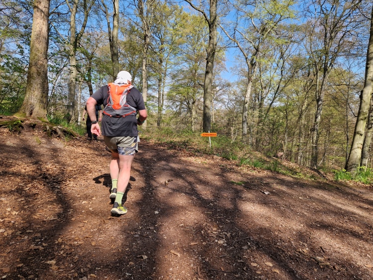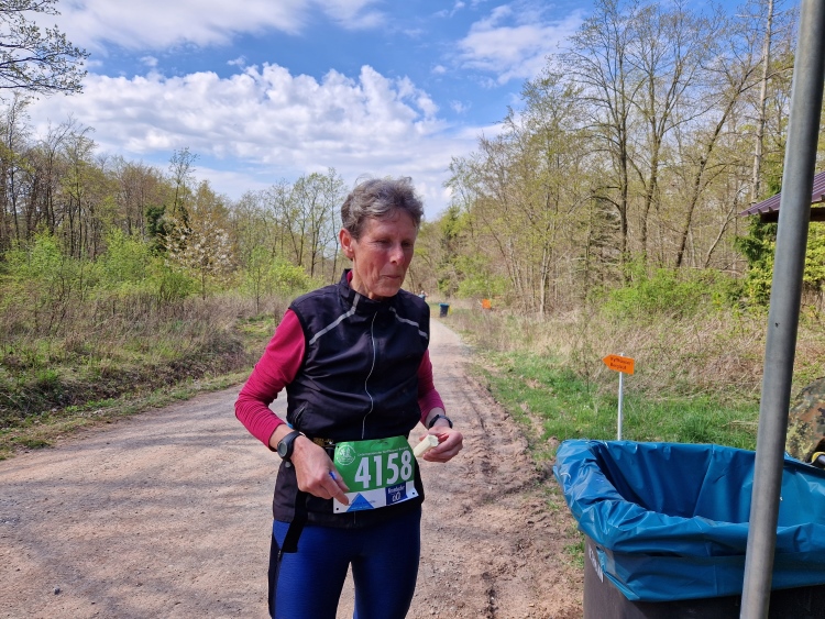 Dann am Ententeich bei Kilometer 34 die nächste willkommene Verpflegung, wieder bei den Soldaten. Dann geht es (mehr als das es läuft…) den berüchtigten zehnprozentigen Anstieg zum Dreiforststein hinauf. Sechs Kilometer vor dem Ziel frage ich mich, wann es endlich nur noch bergab läuft? Der Berg lacht nochmal hämisch und pustet uns seinen warmen Atem ins Gesicht. Ein, zwei Mal noch quält er uns mäßig steil aber empfindlich hinauf.