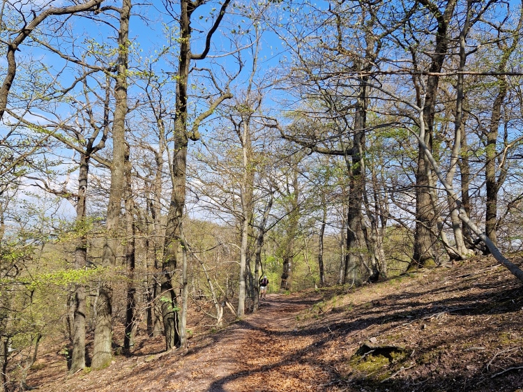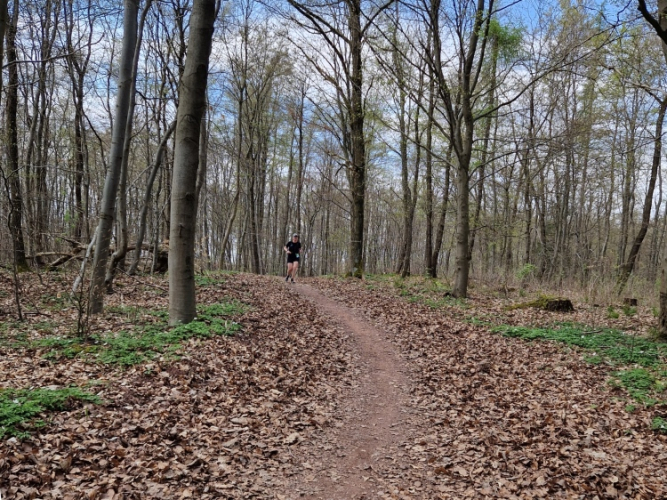 Die Besuchertreppe läuft es noch hinab, dann beginnt das sechs Kilometer lange Bergsteigen zum Kyffhäuser Denkmal hinauf. Gleich wird es empfindliche 15 bis 20 Prozent steil auf felsbröckligen Untergrund. Der Puls schießt hoch, Schnappatmung setzt ein. Der Berg lacht dazu laut auf. Dann läuft es auf mäßigerem circa 5 Prozent steilem Forstweg erträglich hinauf. Die Frühlingssonne wärmt, der Wald spendet Schatten. Der Puls bleibt hoch, der Berg wirft uns seinen heißen Atem ins Gesicht. Nach 19 Kilometern, wir wähnen uns bald oben, wird es wieder an die 10 Prozent steil. Ein paar Meter geht es mehr als das es läuft einen Hangweg hinauf. Irgendwann sind wir oben am Fuß des Denkmals angelangt. Wir müssen aber noch am Burghof Hotel, am Steinbruch und an den hohen Steinmauern der Unterburg vorbei und dann natürlich weiter hinauf zur Oberburg Kyffhausen. Die schnelleren Marathonis kommen uns dabei entgegen. Grüß Dich Anja, hallo Roland.
