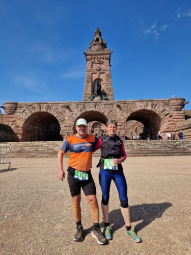 Nach 22 Kilometern sind wir dann oben vor dem Denkmal und zu Füßen der Kaiser Barbarossa und Friedrich Wilhelm. Wir müssen einen Wendepunkt umrunden und stürzen uns dann auf die Verpflegung. Ulrike (WKF-Bergfried 91 Dresden) gönnt sich ein alkoholisches Pils. Ich ziehe den Haferschleim vor. Nach dem Fotoshooting müssen wir weiter, nur noch 20 Kilometer bis ins Ziel. Zunächst hinab und an der Baustelle der neuen Besucherstätte vorbei zurück in den Wald.