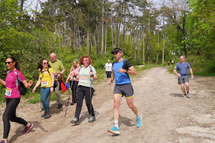 Die Mittagssonne brennt echt sommerlich. Auf dem Naturweg zwischen Tilledaler Tor, gute drei Kilometer vor dem Ziel, läuft es aus dem Wald heraus und durch eine pittoresk blühende Obstbaumallee, am Panoramamuseum vorbei, den Schlachtberg hinunter nach Bad Frankenhausen - mit wenig Schatten. Am Wanderdrehkreuz Tilledaler Tor stärken sich die Läufer am letzten der überall gut bestückten und auch gut besetzten Verpflegungspunkte. So mancher kippt sich einen kühlenden Becher Wasser über den Kopf.