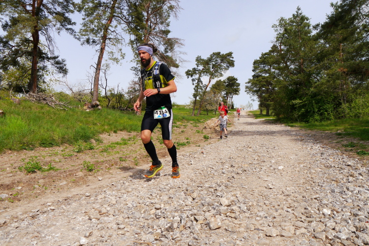 Ich laufe hinunter zum Schlossplatz und reihe mich in das Starterfeld der 13,5 Kilometerläufer ein. Eine klassische Läuferknieverletzung im Winter bremste mein Marathontraining aus. Echt gut, dass es beim KBL mehrere Streckenangebote gibt. Der Lauf ist ein knackiger Berglauf-Fetzer. Meist auf Naturwegen geht es erst drei Kilometer ordentlich hoch, dann rund drei Kilometer am Flugplatz nach Udersleben runter, dort links ab vier Kilometer nicht allzu steil hoch und die letzten drei wieder teils steil runter. Ich komme gut über die rund 250 Höhenmeter. Und ganz wichtig: das Knie hat gehalten!
