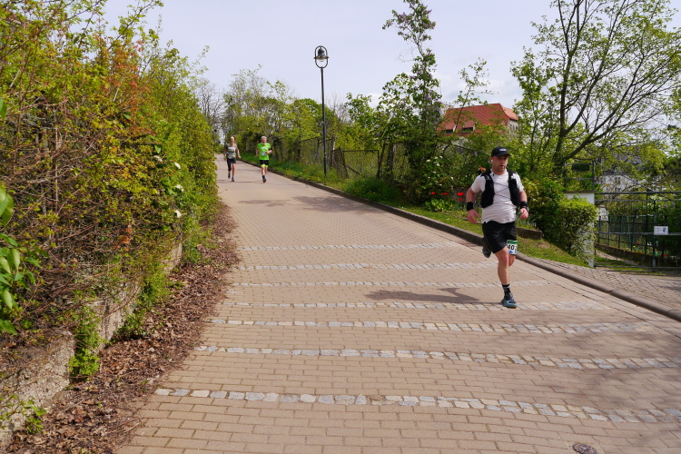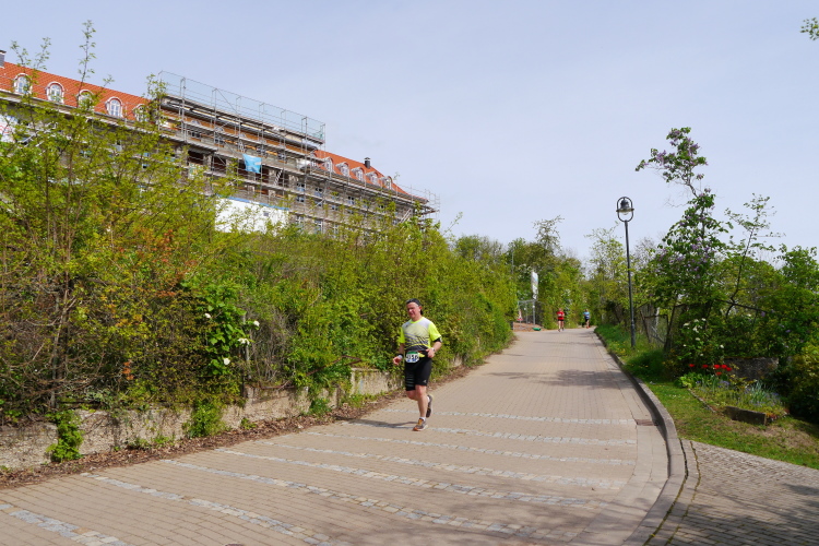 Die ersten und die letzten drei Kilometer sind bei den 13,5 Kilometern, dem halben und dem ganzen Marathon die gleichen. Wieder mit der Kamera begebe ich mich auf die letzten Kilometer zurück und fotografiere die den Schlachtberg hinunterlaufenden Läufer und Walker. Es ist anfangs gar nicht so einfach, die Marathonläufer mit den 4 000’er Startnummern auszumachen. Denn es laufen jetzt auch die 6 Kilometer, die Halbmarathonis und die Walker den Schlachtberg hinunter. Das ist ein buntes Bild, aber es wird mitunter auch eng, wenn die Läufer die Walker überholen. Aber mit freundlichen Zurufen und gegenseitiger Rücksichtnahme funktioniert das ganz gut.
