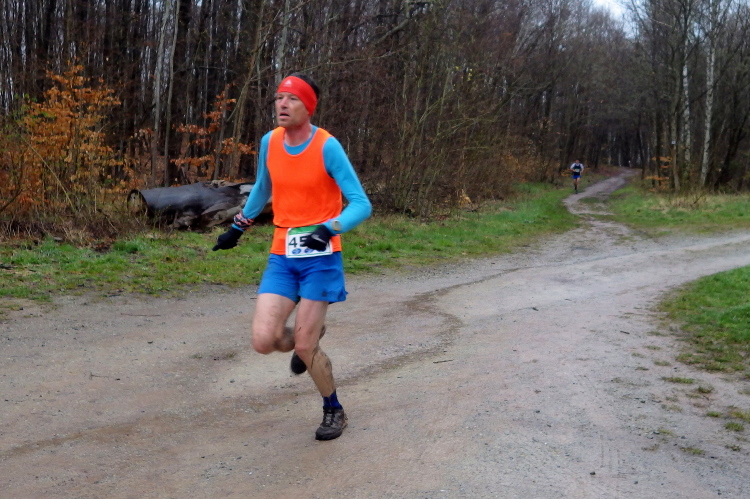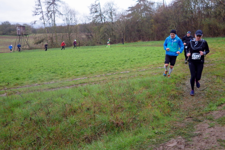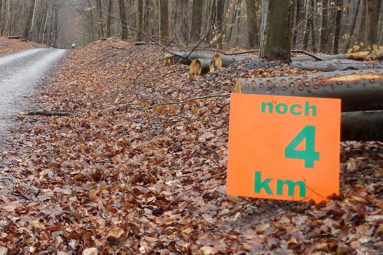 Zurück auf dem Rennweg bleiben uns die mystischen Bilder erhalten, denn wir laufen durch wolkenartige Nebelschwaden. Bald haben wir am Kautsberge mit 450 Metern den höchsten Punkt der Strecke erreicht. Also läuft es von nun an überwiegend bergab. Und es wird wieder spannend, denn wir tasten uns auf einigen matschigen Passagen voran.
