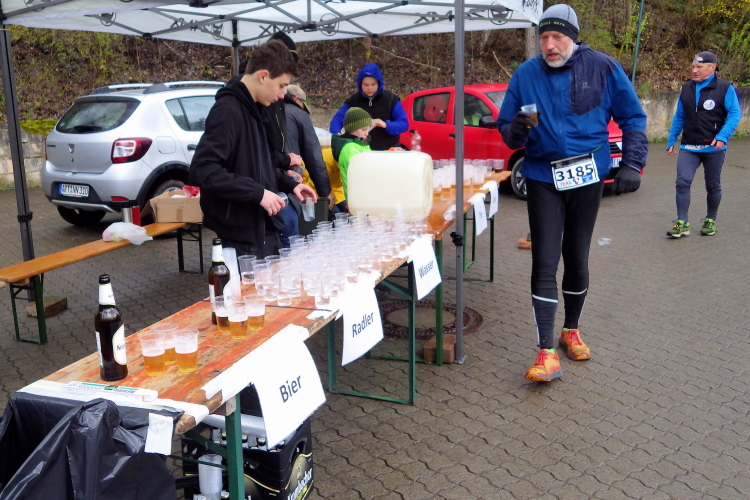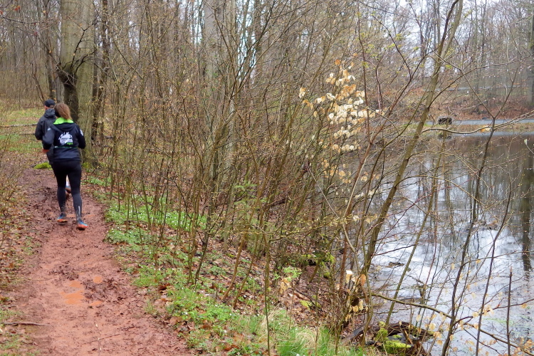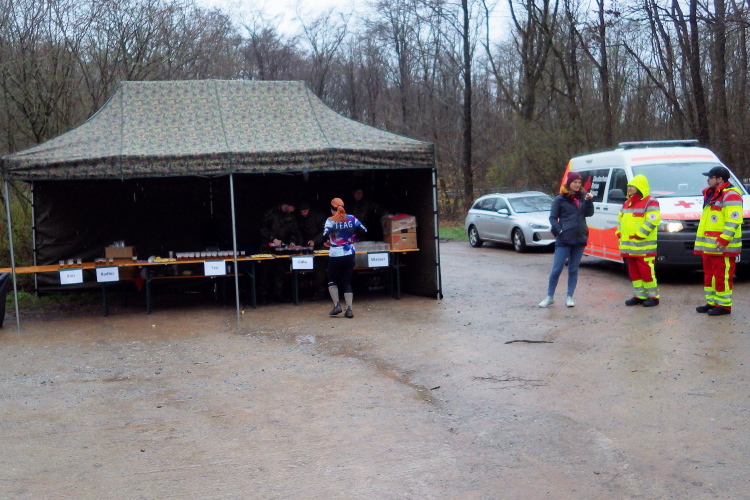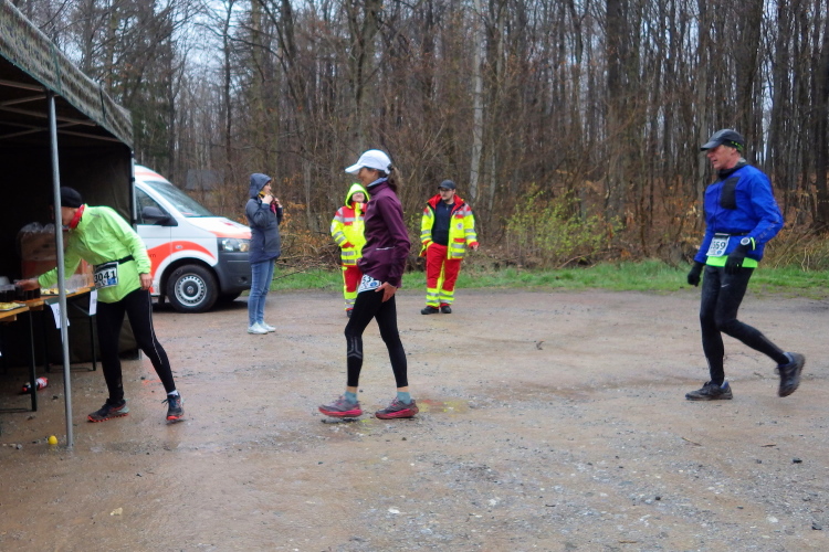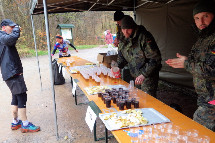 Bei Kilometer 14, am Ententeich, werden Marathon- und Halbmarathonstrecke wieder zusammengeführt und der Verpflegungspunkt der Bundeswehr kündigt sich mit zünftiger Hartrockmusik an. Doch es geht hier wie überall nett zu. Viele Läufer bedanken sich für die Bewirtung. Die nächste Passage vom Ententeich hoch zum Wegepunkt Dreiforststein ist berüchtigt und altbekannt. Zunächst dürfen wir Läufer unsere Schuhe mit dem roten Matsch weihen und dann führt es nochmal knackig bergan.