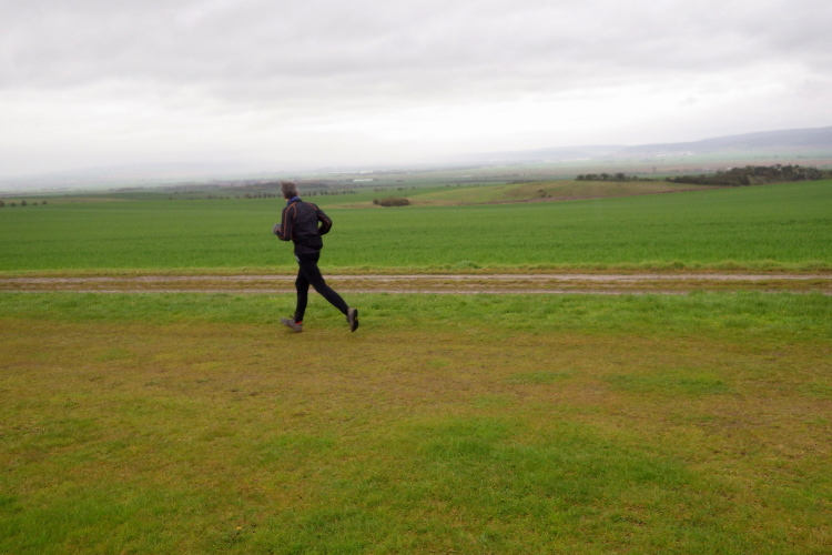 Noch sind keine zwei Kilometer gelaufen und es wird zum ersten Mal spannend. Wir queren auf den ersten Feldweg ein und pirschen uns mühsam durch den Matsch oder auf dem Feldrand hinauf. Der weite Landschaftsblick hinab ins Kocherntal entschädigt uns dann bald dafür.