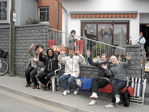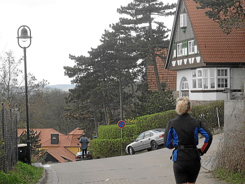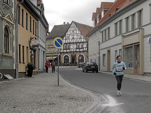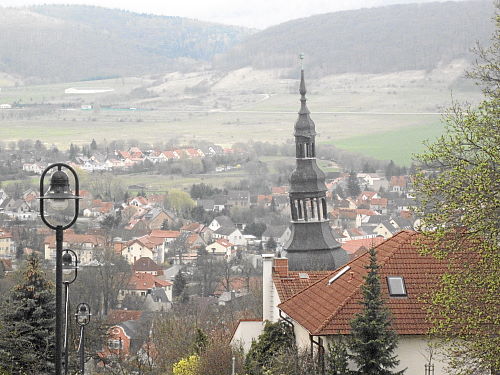 Der Flugplatz lag hinter uns (noch 5 km) und es ging in ein Wäldchen hinein und abwärts, aber Tempo konnte man auf den nächsten zwei Kilometern trotzdem nicht machen, der Untergrund des Pfades war zu anspruchsvoll. Mist, das mit den fünf Stunden würde knapp werden! Immer wieder ging es auch leicht aufwärts, bis wir dann endlich das Panoramamuseum erreicht hatten. Kurz danach kam man wieder auf eine Asphaltstraße oberhalb von Bad Frankenhausen. Der schöne Blick auf das Städtchen interessierte jetzt wenig, auch nicht die schiefe Kirche „Unser Lieben Frauen am Berge“ die wir oberhalb passierten, denn wir mussten uns sputen. Im Eiltempo ging es an den schönen Häusern vorbei die steile Straße hinunter, noch einen Kilometer durch den Ort bis zur Wiese mit dem Ziel.