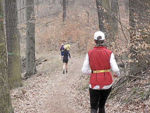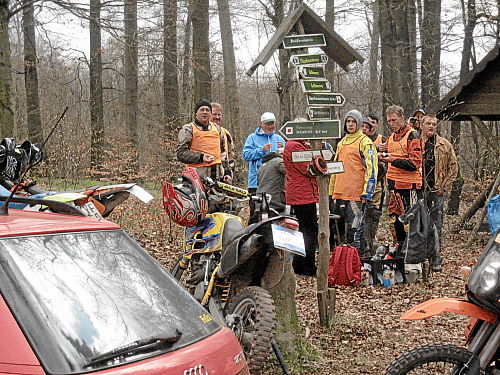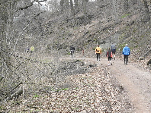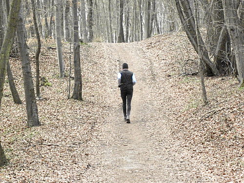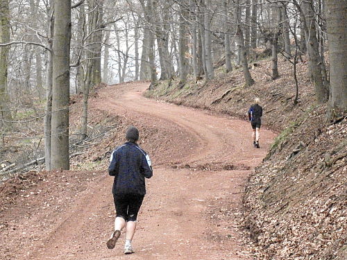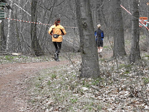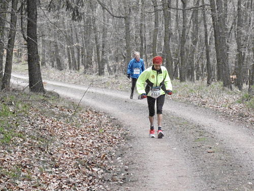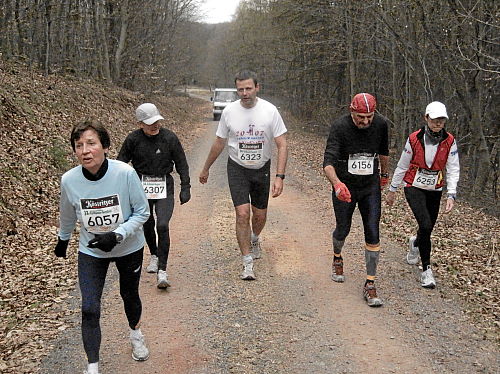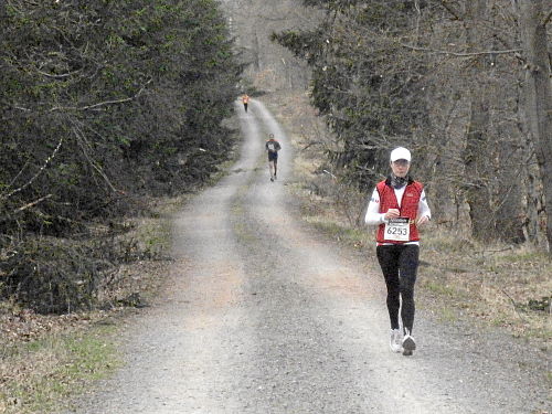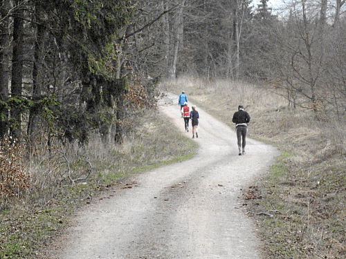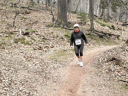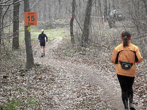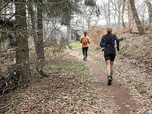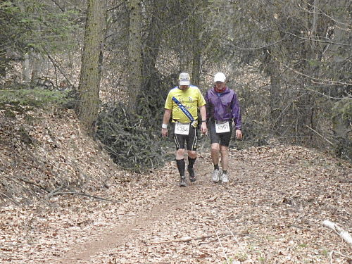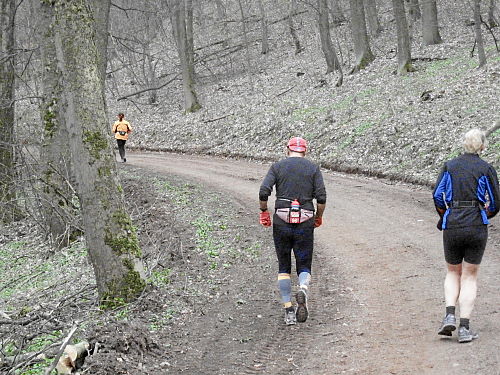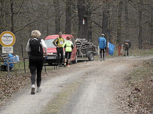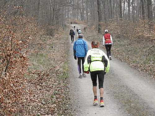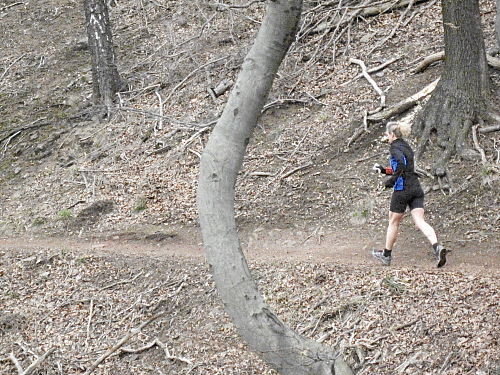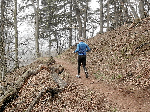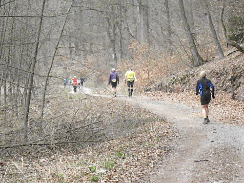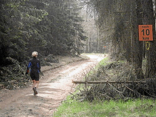 Das Wetter hatte bis jetzt gehalten, ab und zu war sogar die Sonne kurz zum Vorschein gekommen und es war auch etwas wärmer geworden. Die vergangenen 15 Kilometer durch den Wald waren den Lauf alleine Wert und es ging ja noch weiter. Der Weg wurde breiter, schlängelte sich sanft durch den Wald und das Höhendiagramm zeigte, dass es ab jetzt die letzten 14 Kilometer gemächlich abwärts ging. Der breite Waldweg war bestens, hier konnte man Zeit gut machen und also legten wir an Tempo zu. Die Anstiege hatten doch mehr Zeit gekostet als gedacht, so dass ich mir bis dahin gar nicht mehr so sicher war, ob wir die fünf Stunden einhalten konnten.
