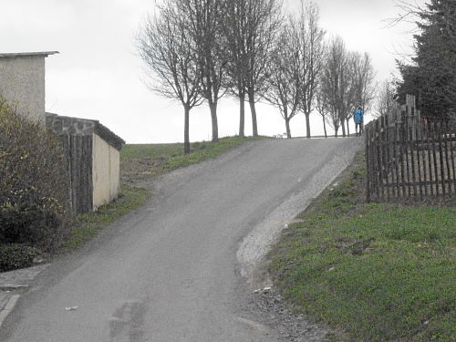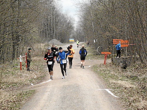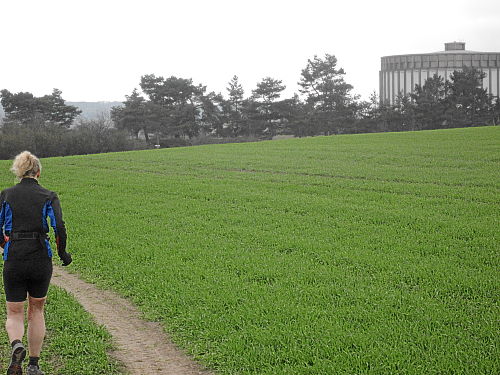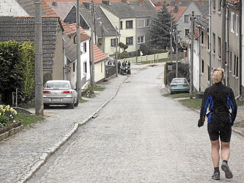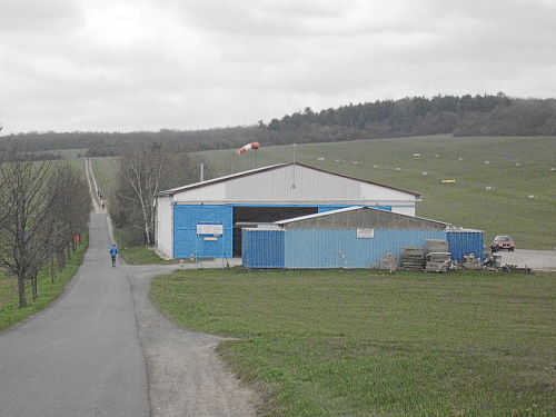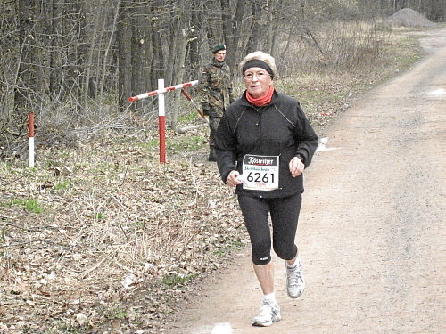 An der Verpflegungsstelle im Ort gab es wieder u.a. Cola und sogar Schwarzbier und Brote. Dann kam der steile Anstieg hinaus aus dem Dorf bis der Flugplatz vor uns lag. An diese zwei Kilometer kerzengerader Strecke dem Platz entlang, unmerklich ansteigend, konnte ich mich bestens erinnern, es war heiß damals und schattenlos. Dagegen war es diesmal geradezu angenehm zu laufen.